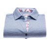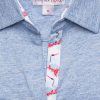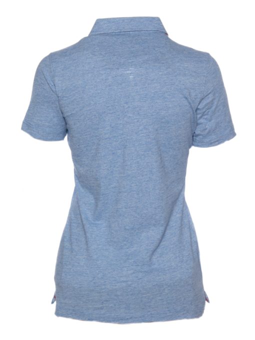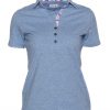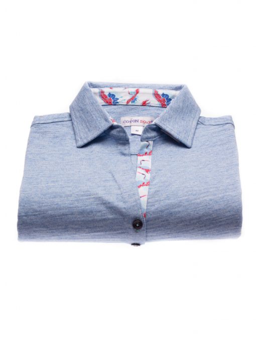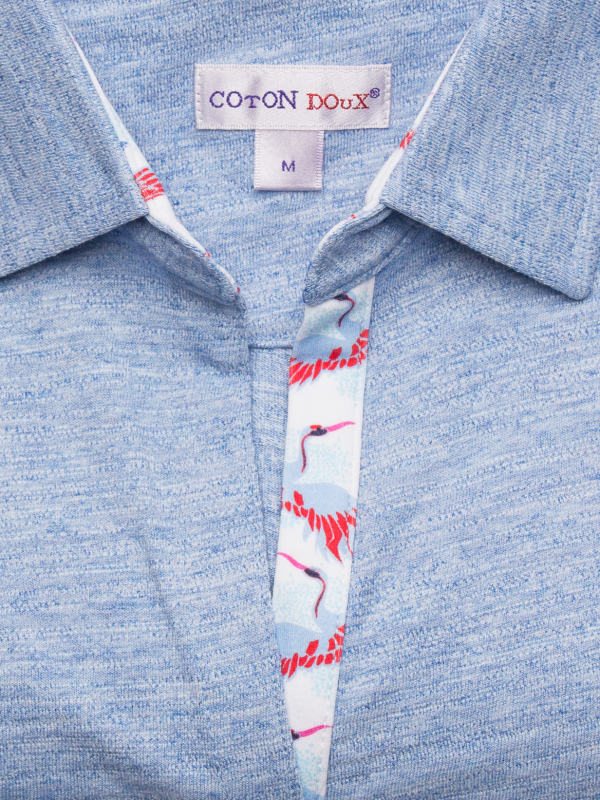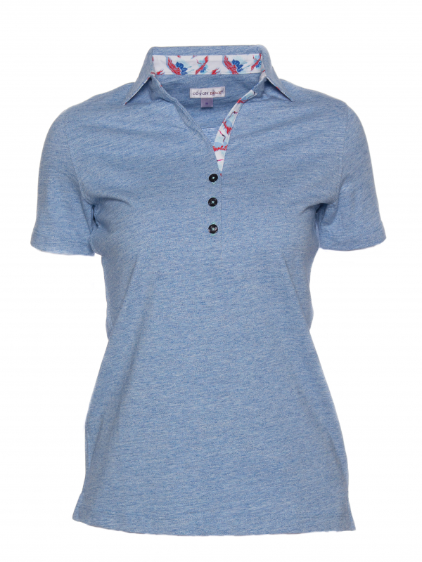 If you are a simplicity lover but you insist on details, this blue mottled polo shirt in cotton jersey has everything to satisfy you. Dressed with a crane print contrast on the inside of its collar and its triple buttons, it will be the ideal piece for a casual and sophisticated style. You will also appreciate the shape it will give you thanks to its fitted cut and its cotton piqué collar. Over white trousers and a pair of denim-style platform espadrilles, all you have to do is show off your style!