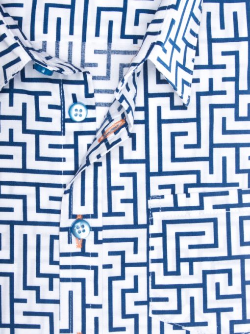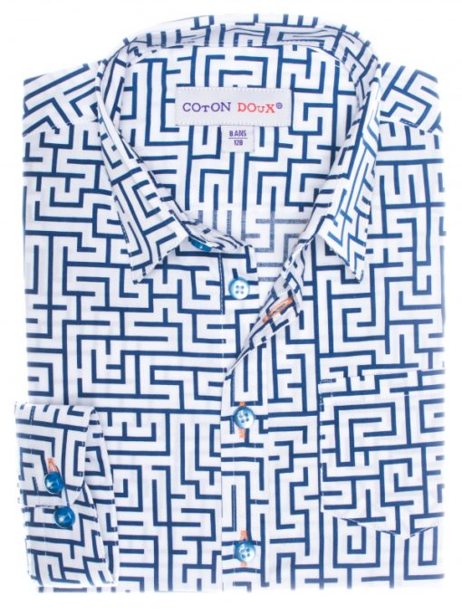 This labyrinth print shirt is perfect for kids of all ages and will catch the attention of everyone who passes by! It can be easily worn with jeans or a navy skirt and will please your toddlers thanks to its soft collar and loose fit. We also love its double-button cuffs and orange button detailing!