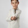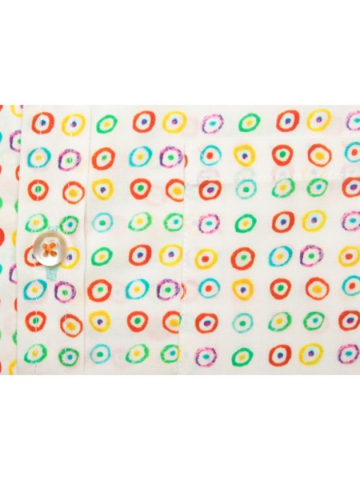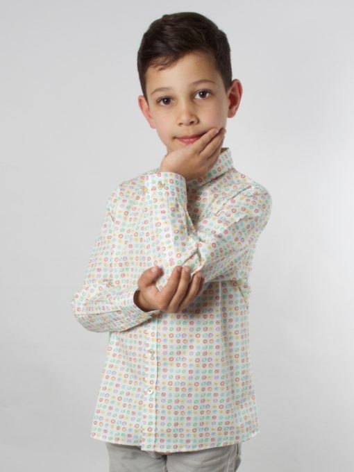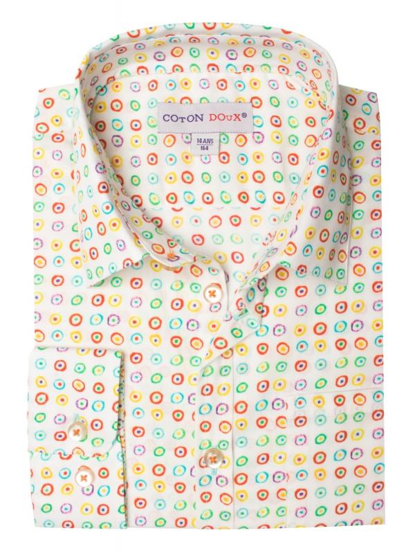 Children like slightly acid colours. This beautiful shirt with patterns of colourful circles against a beautiful white background will necessarily appeal to them especially if it is combined with faded jeans. A close-fitting cut, little collar and two-button cuffs complete its trendy look.