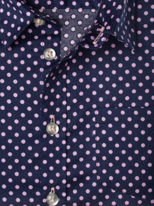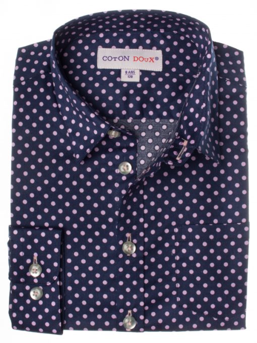 Opt fo this must-have waiting for your children’s tastes to be shaped! This navy blue shirt with rose dots in loose cut will perfectly match with their everyday outfits. It will stand out though with its elegance thanks to its double-button cuffs and soft collar. For a special occasion, this model will be sublimated by a pinky touch: a bowtie for him, a pair of lacquer shoes for her?