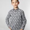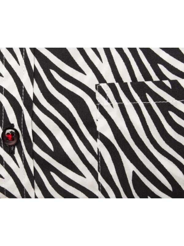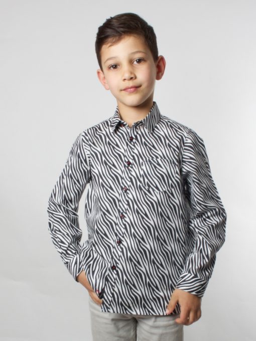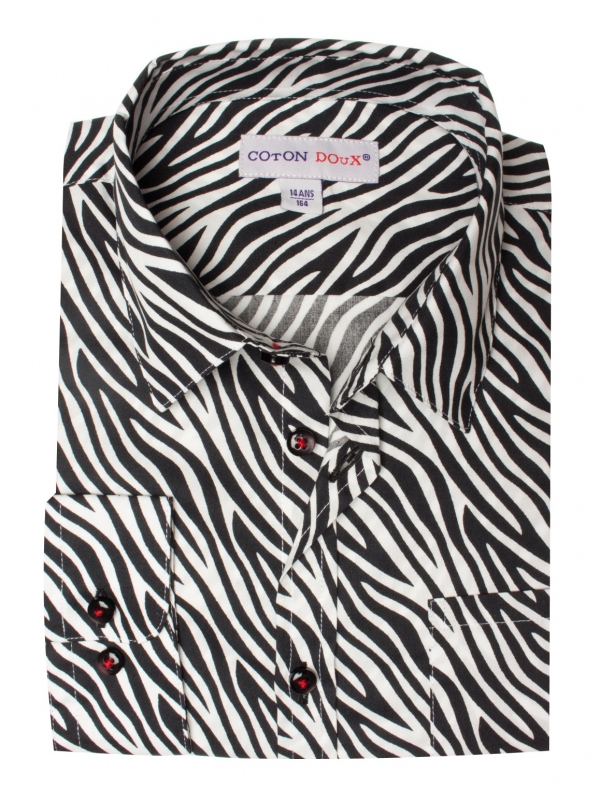 This shirt’s black and white stripes are extremely elegant and will appeal to children who like fashion. A little collar, close-fitting cut and two-button cuffs decorated with red overstitchings make it a perfect style to wear with faded jeans for a very rock look.