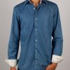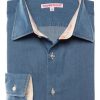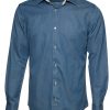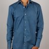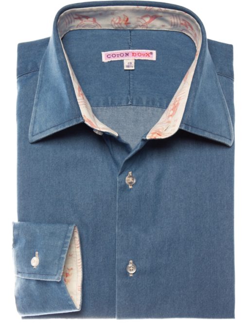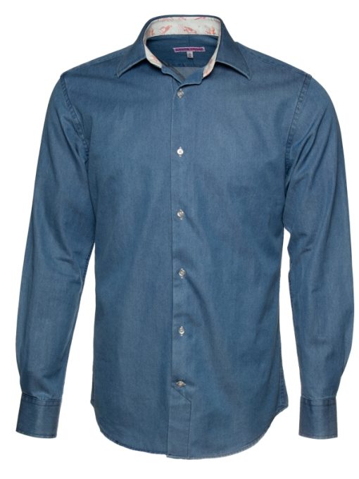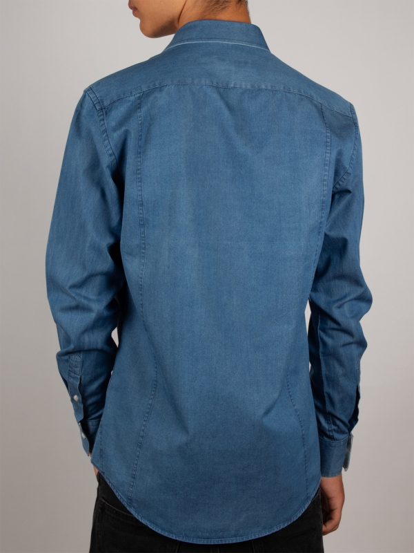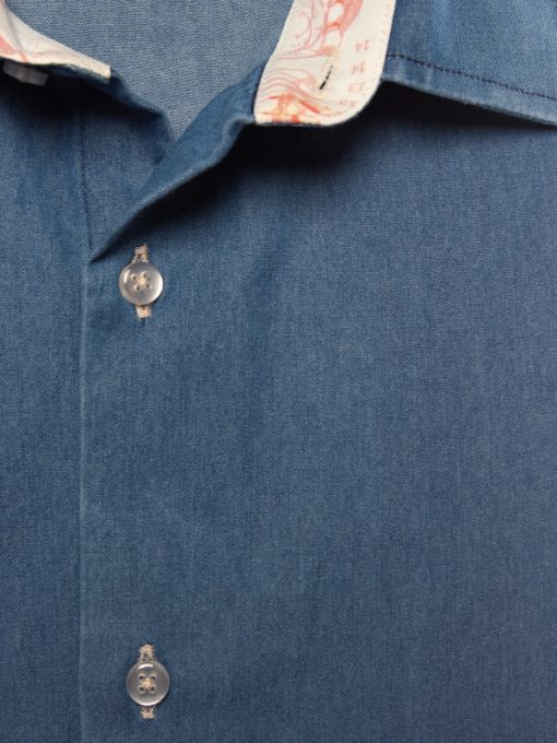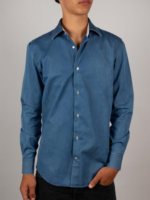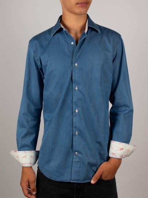 With its blue denim and tailored regular cut, this shirt offers a refined, modern twist on a menswear classic. The simple cuffs provide a clean finish, while the inner contrast adorned with exotic stamp motifs; adds a bold, graphic surprise. Balancing simplicity and originality, it’s the perfect piece for a smart casual look.