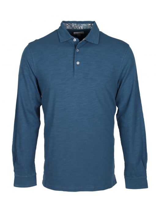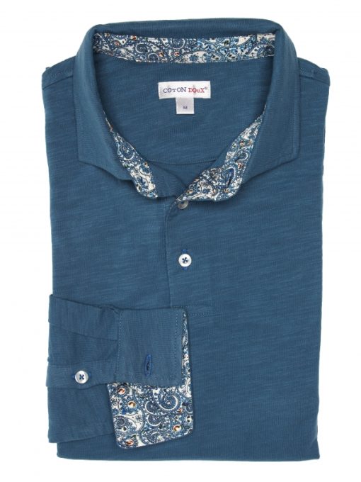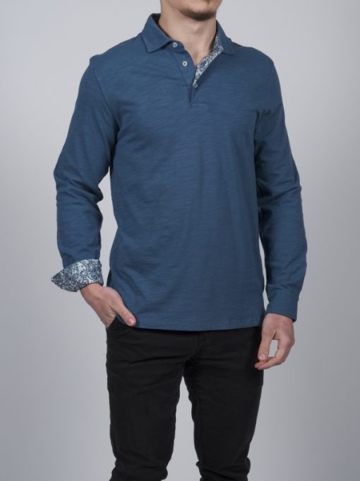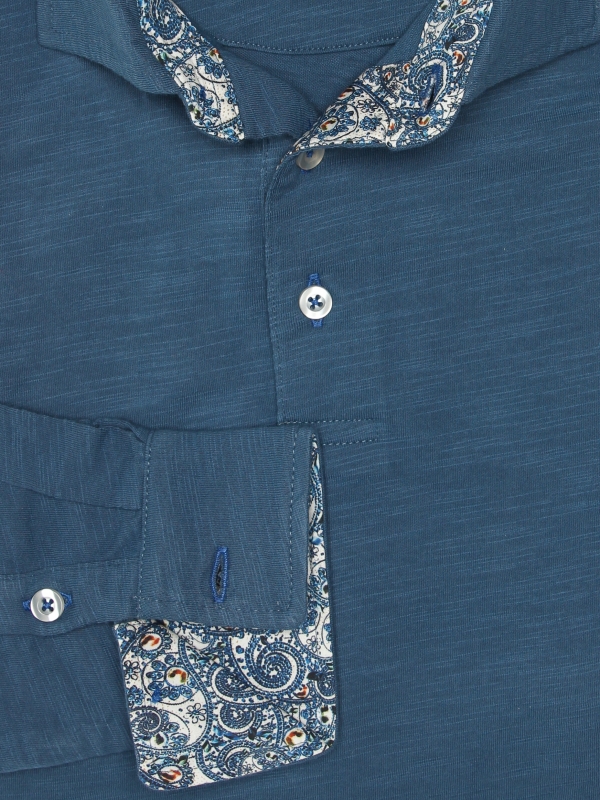 If you are a fan of elegance and lightness, this blue-grey long sleeve polo shirt in pure cotton with arabesque inner lining print is for you! You’ll keep it simple, but still have a unique and eye-catching pattern hidden under the cotton piqué collar and two-button placket. The slim fit and double button cuffs will keep you comfortable and looking good all day long. Wear it with a caramel coloured chino and brown boots: you’ll be classy in any situation!