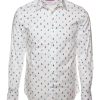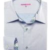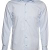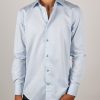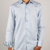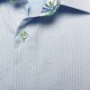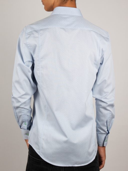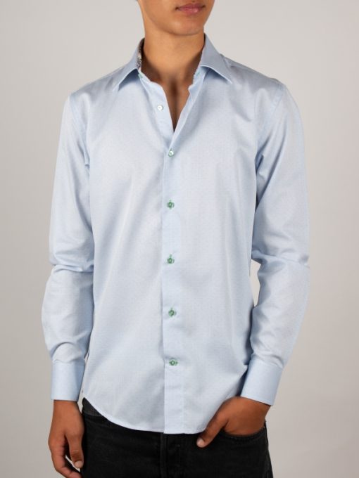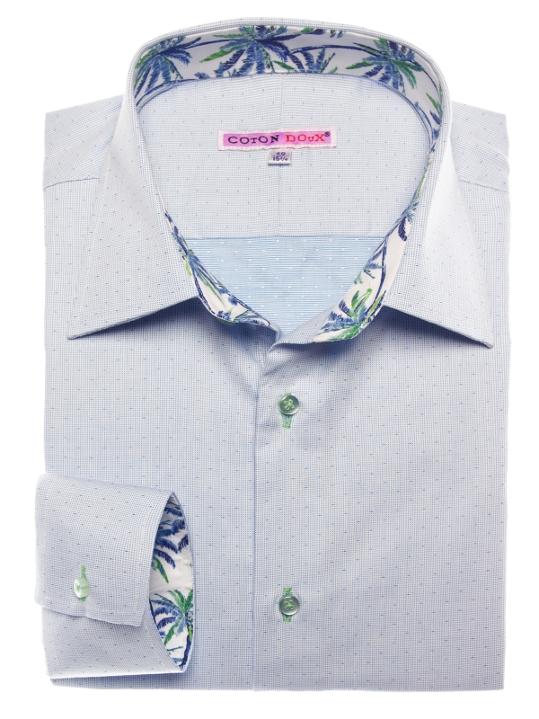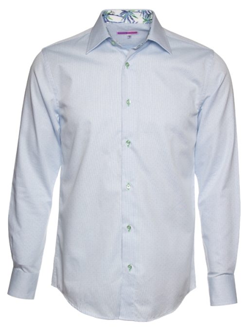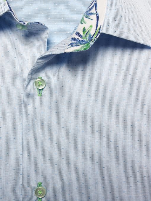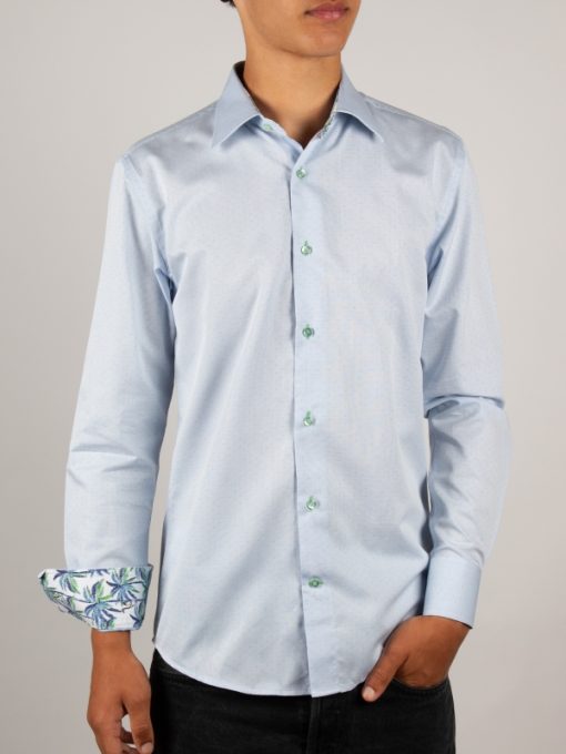 Crafted from refined jacquard weave, this blue shirt with a tailored regular fit stands out through its subtle texture and understated elegance. Beneath its simple exterior, it reveals an inner lining adorned with palm tree motifs, adding a fresh, summery touch. Simple cuffs provide a neat finish, perfect for everyday style. A piece that perfectly combines sophistication with a spirit of escape.