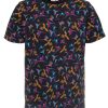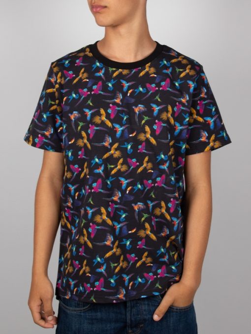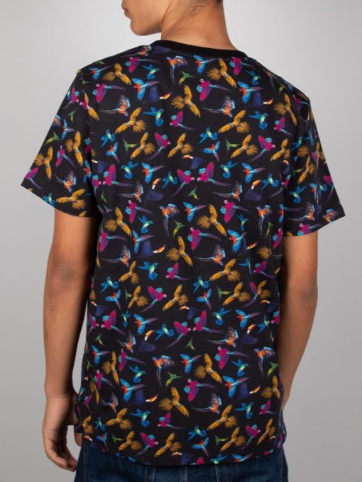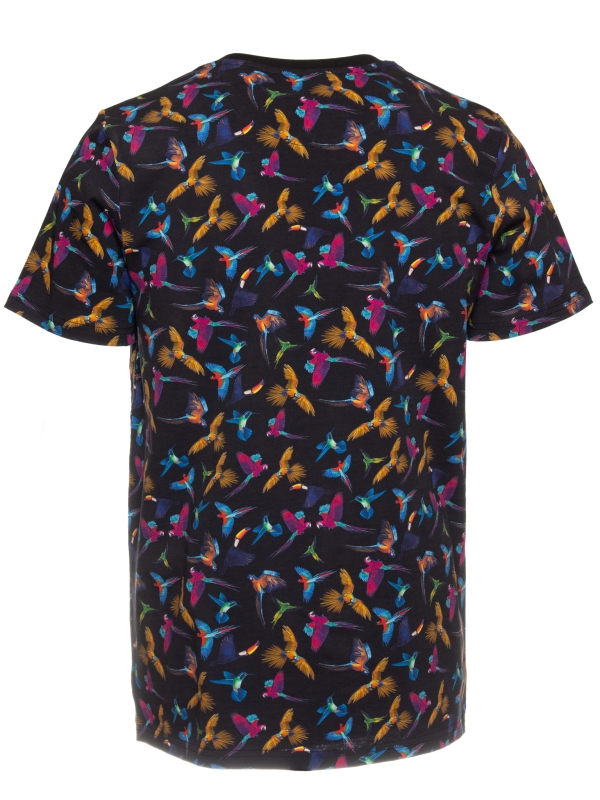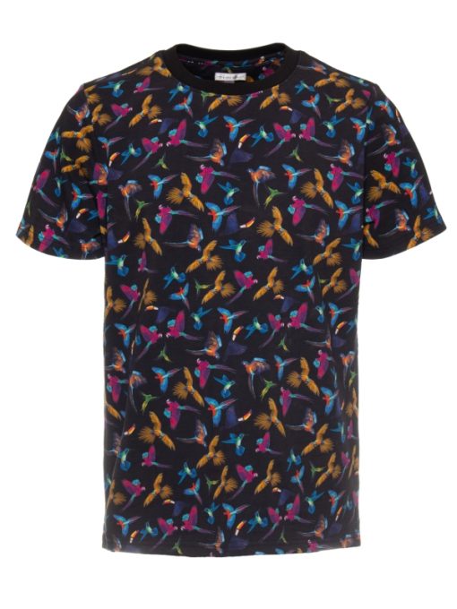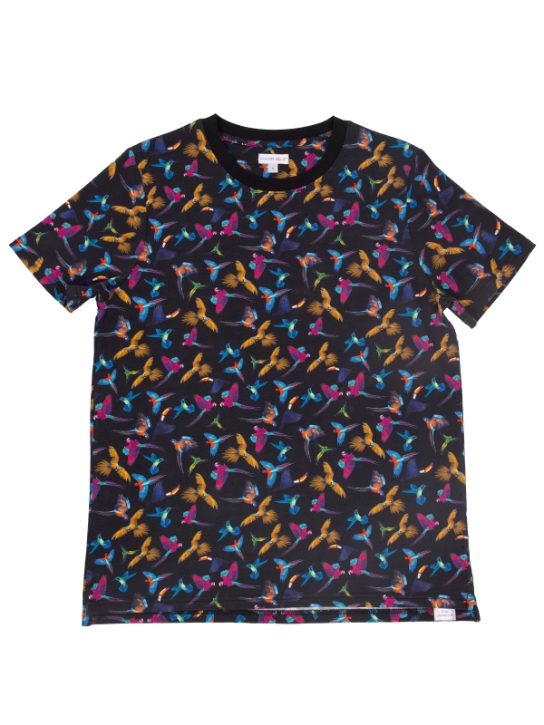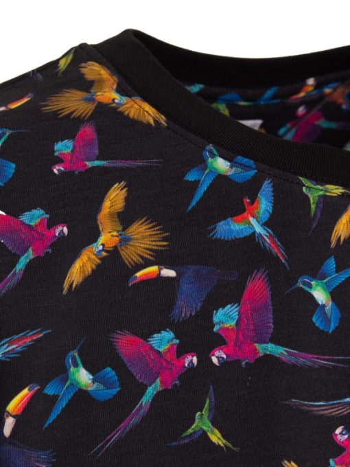 Add a touch of exotic flair with this deep blue T-shirt, featuring vibrant tropical birds. Made from soft mercerized cotton, it offers a comfortable unisex straight cut with a ribbed crew neck. The back neck yoke, side slits, and double-needle stitching ensure a durable and refined finish. Perfect for a fresh, modern summer look.