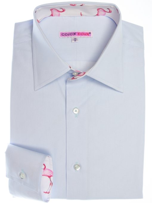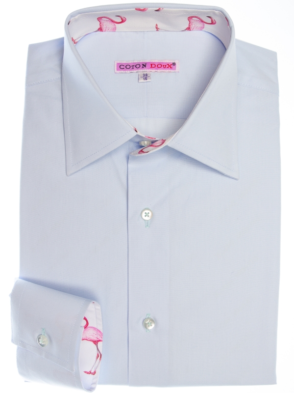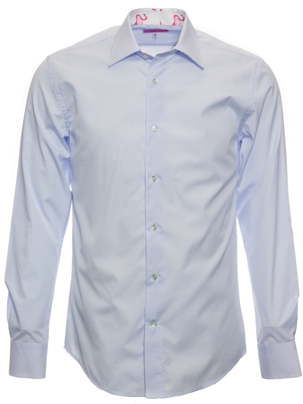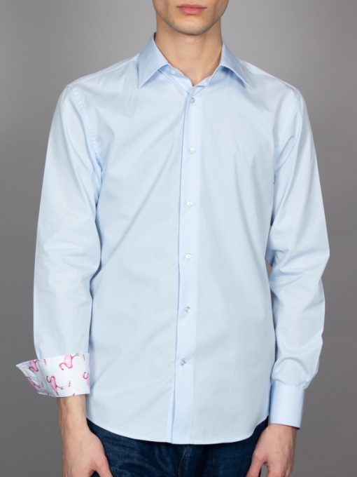 This light blue poplin shirt offers a refreshing look with its Milanese collar, single cuffs, and regular fit. But it’s the hidden flamingo print on the inner lining that adds an unexpected splash of personality. The perfect balance of polished and playful, it’s a shirt that says you take style seriously, but you’re not afraid to let your fun side show when the buttons come undone.