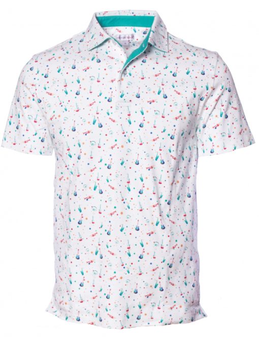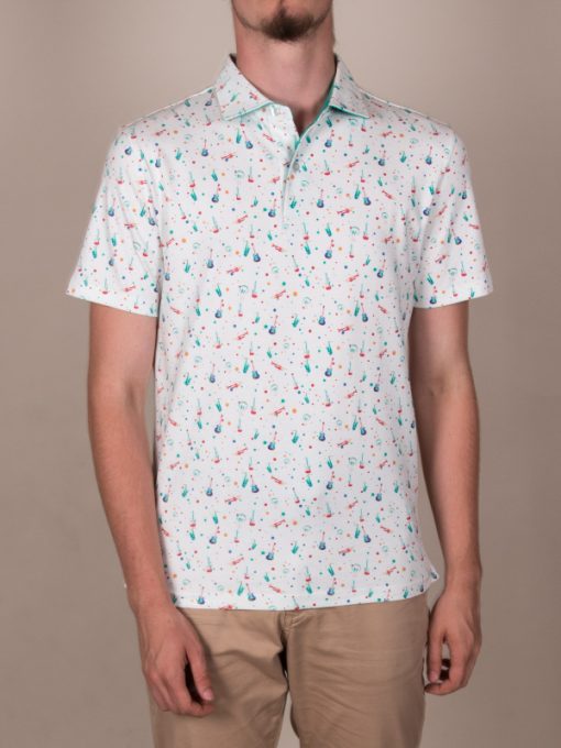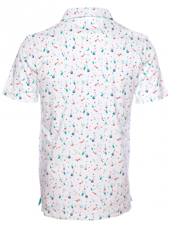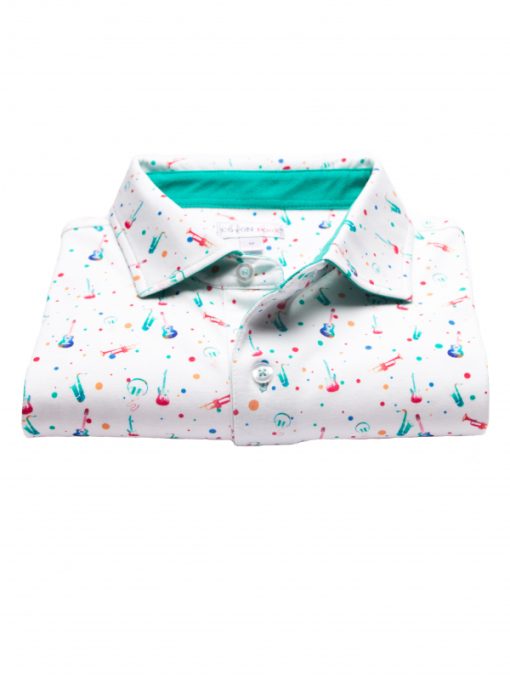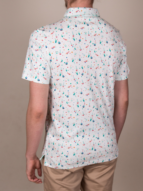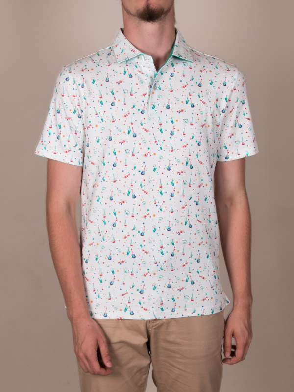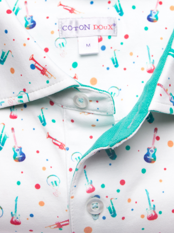 Music and fashion lover, this cotton jersey polo shirt is made for you. Its light tones will give brightness to your outfit while bringing peps to it thanks to the printed musical instruments. Its light tones will give brightness to your outfit and its green piqué collar will pop out perfectly on jeans. Wear this adjusted polo open or closed thanks to its two-buttons placket, and make every music lover around you jealous.