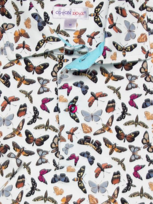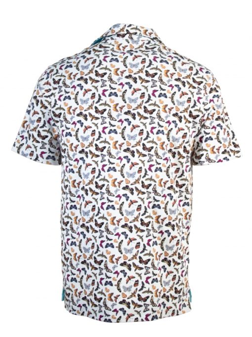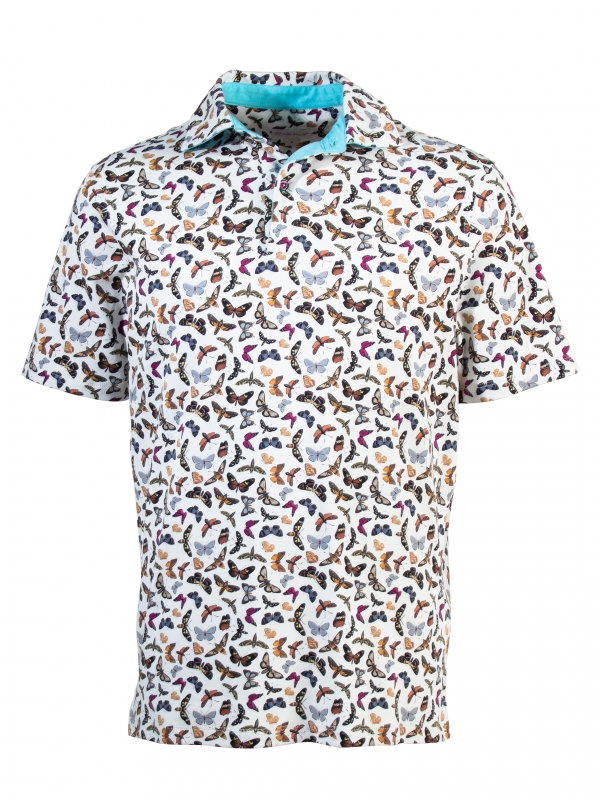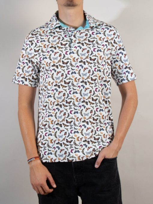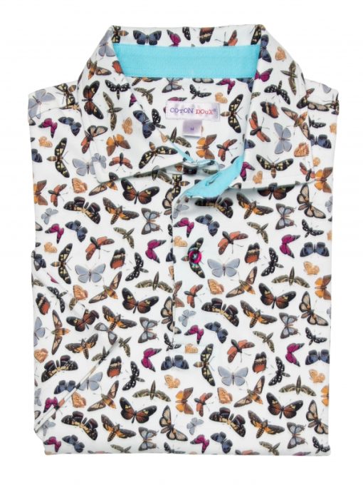In all shapes and colours, the butterfly print polo pays tribute to their diversity. Made from mercerized cotton jersey in a regular fit, it’s perfect for any summer outing. The two-button placket and cotton piqué collar give you the freedom of choice. Make a statement with jeans and a pair of white socks with multicoloured polka dots.