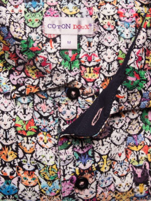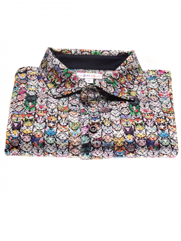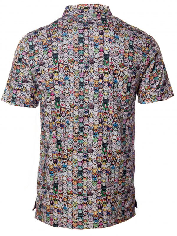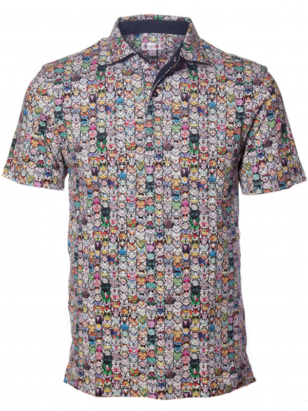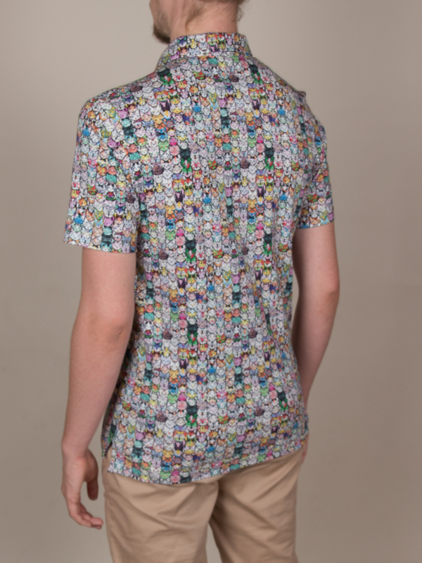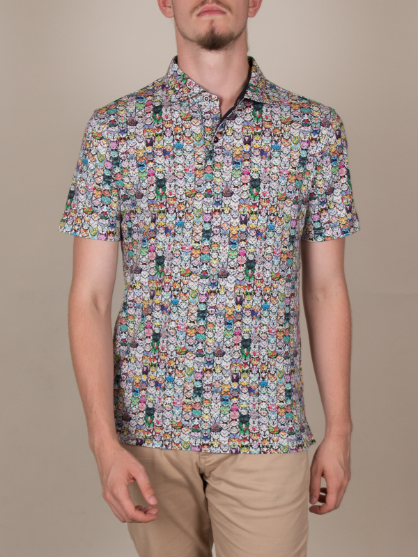 Let this cat print invade your look on this fitted short-sleeved polo shirt. Its mercerized cotton jersey composition and its two-button placket will highlight the “cuddly” side of these cats through a relaxed look. It will easily go with a mustard yellow chino and white sneakers for even more style! Its little extra? A plain piqué cotton collar that gives it a touch of elegance.