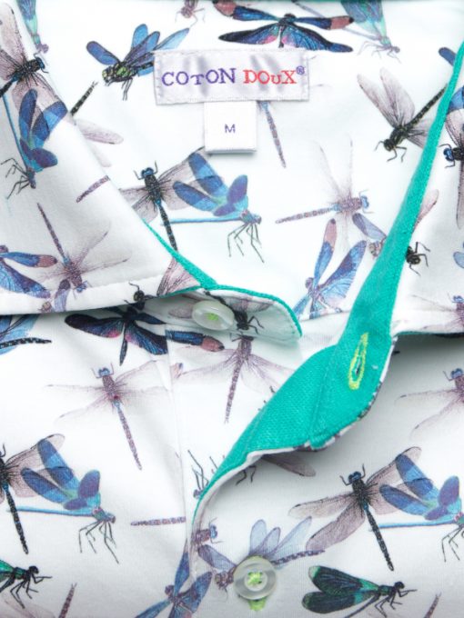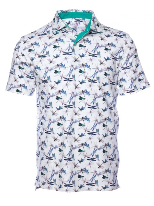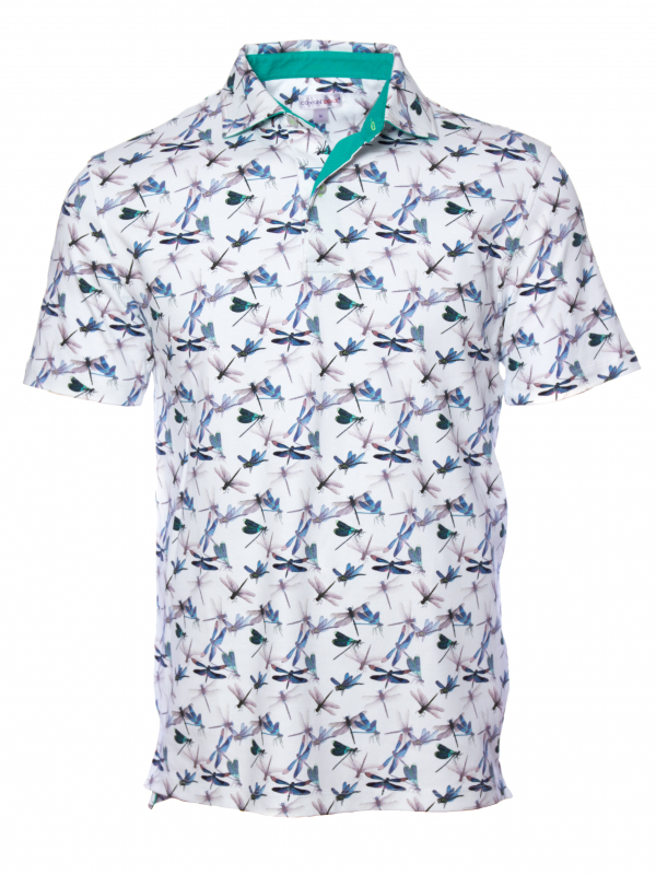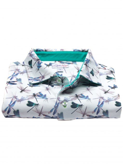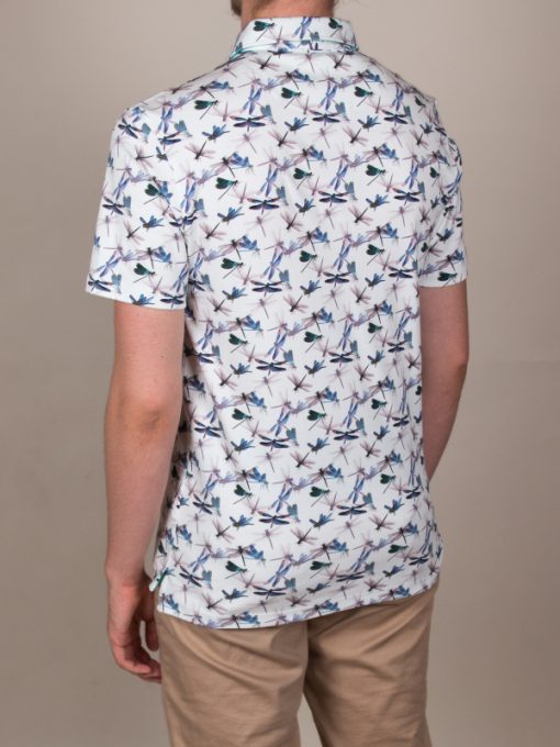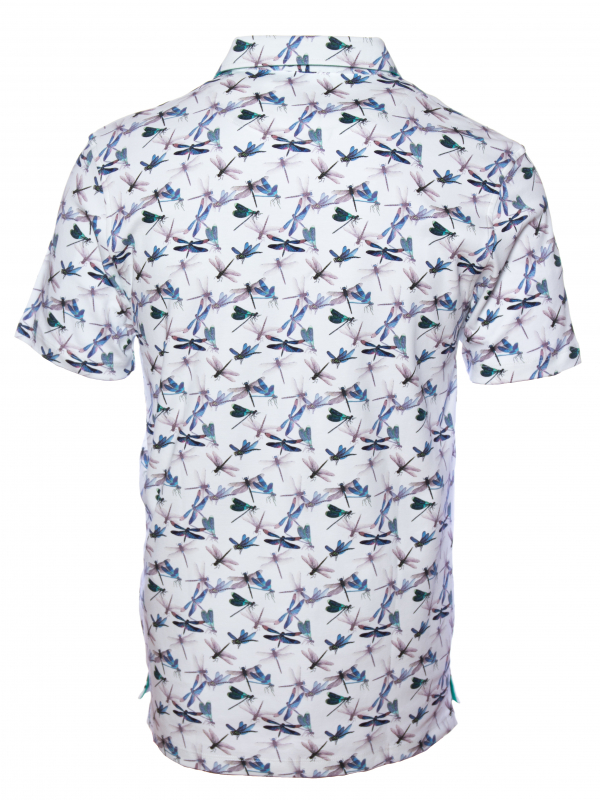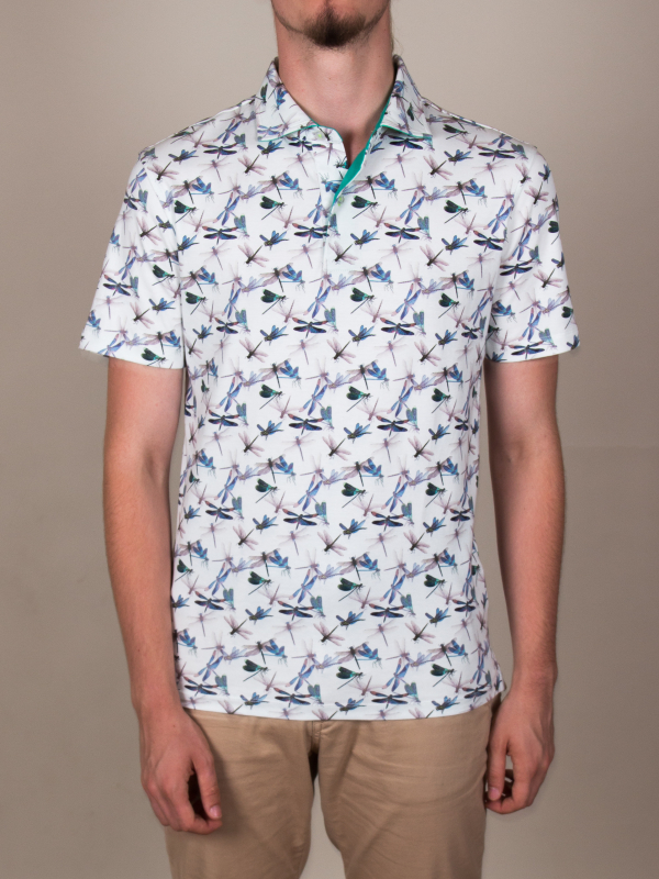 Symbol of lightness and happiness, these small dragonflies full of charm will brighten up your style. The white background of this cotton jersey polo shirt combined with the blue-green of these little bugs is a must have of this summer. Add Bermuda shorts for a casual style or grey trousers for more sophistication, and show off its fitted cut and its two-button placket.
