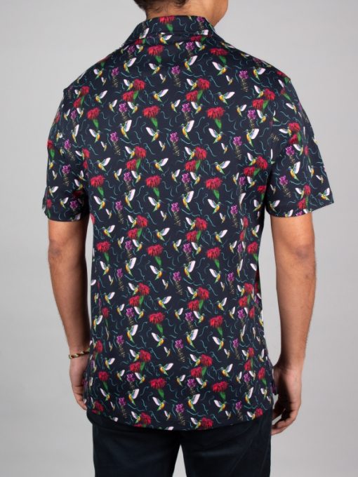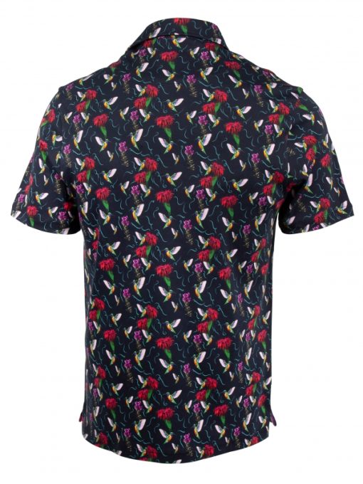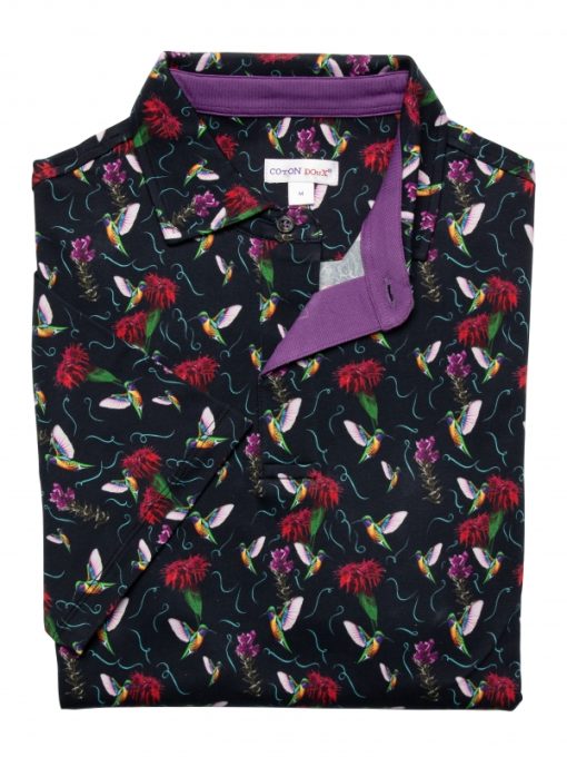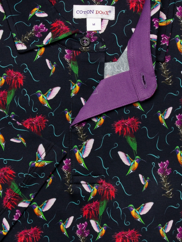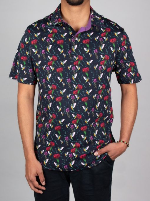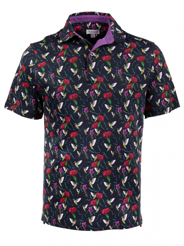 Explore an Edenic garden in our collection, where fluorescent hummingbirds flit among bright pink flowers, brightening up your style. With its regular fit and absolute comfort thanks to mercerised cotton jersey, this polo shirt is irresistibly sophisticated. The two-button placket and purple cotton piqué collar offer an elegant finish, perfect for a casual day out on the town or a night in with friends.