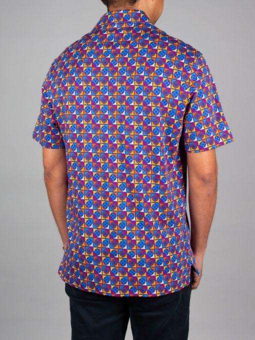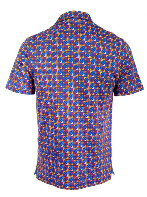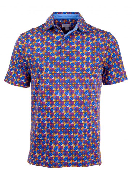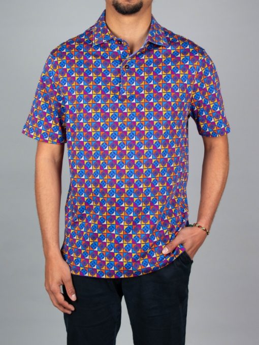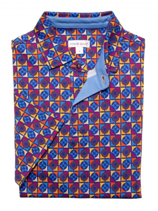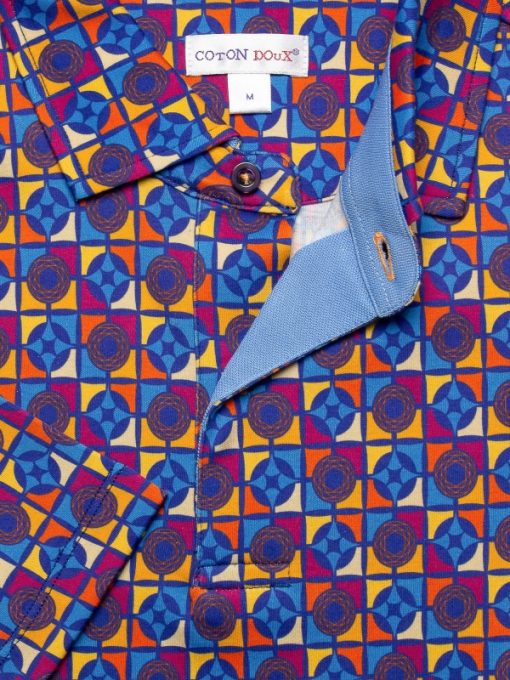 This mosaic-print polo features a striking contrast of colours and shapes. Shades of blue, orange, raspberry and yellow intermingle in a captivating visual harmony. Its regular fit, two-button placket and cotton piqué collar give it a confident, graceful look. Take your chance to shine and enjoy the softness of its mercerised cotton jersey fabric.