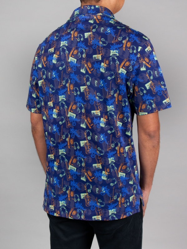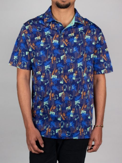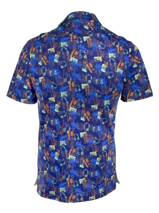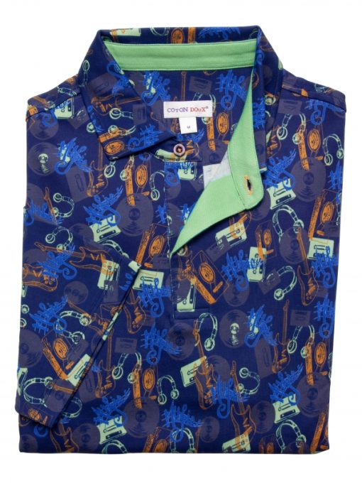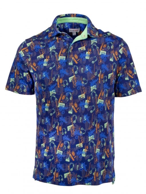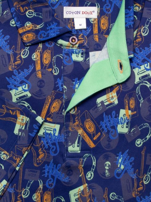 On a navy blue canvas, these musical instruments in pop colors vibrate in unison and will harmonize perfectly with the rest of your wardrobe. This mercerised cotton jersey polo, as soft as a melody, gracefully contours your silhouette with its regular fit. Whether chic or casual, it brings style to your days, and if you pair it with navy chinos, the aqua green cotton piqué collar and two-button placket will stand out beautifully.