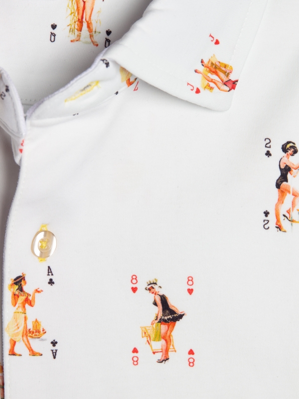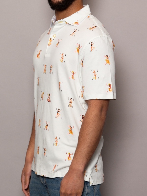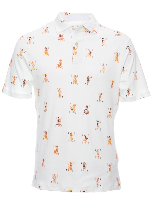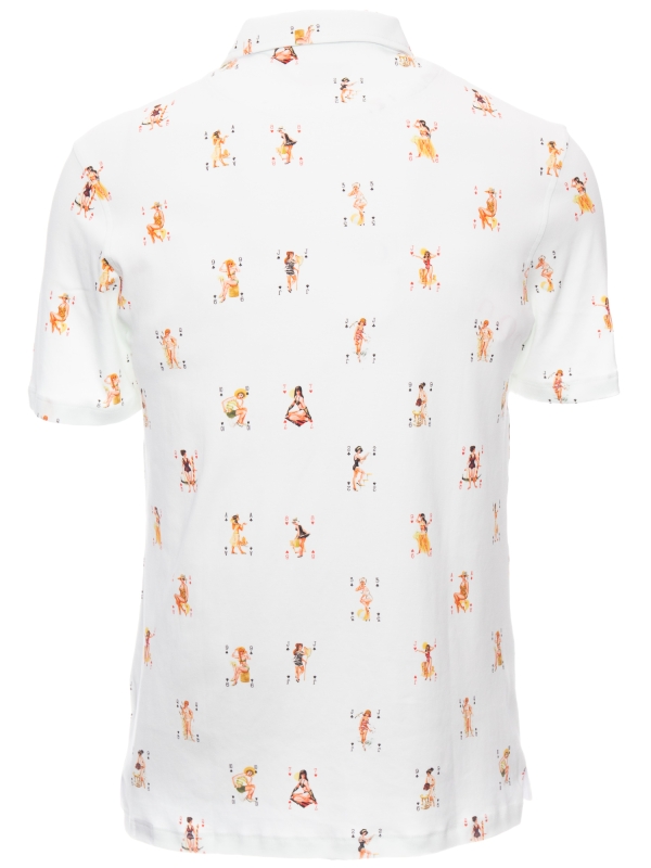 Channel vintage glamour with this playful pin-up print polo, featuring retro card-inspired designs on a bright white backdrop. Crafted from mercerized cotton jersey, it offers a soft, comfortable feel. The cotton piqué collar adds refinement, while the regular fit ensures a flattering shape. Finished with a two-button placket, it’s the perfect blend of nostalgia and modern style.