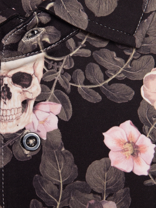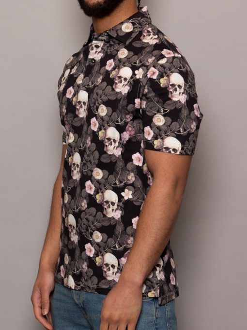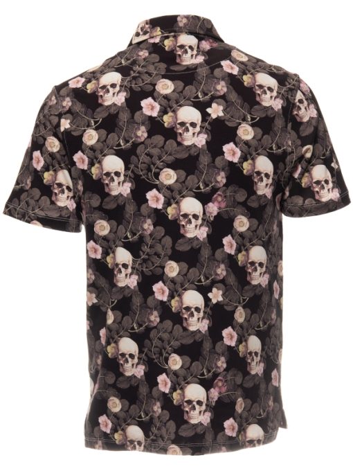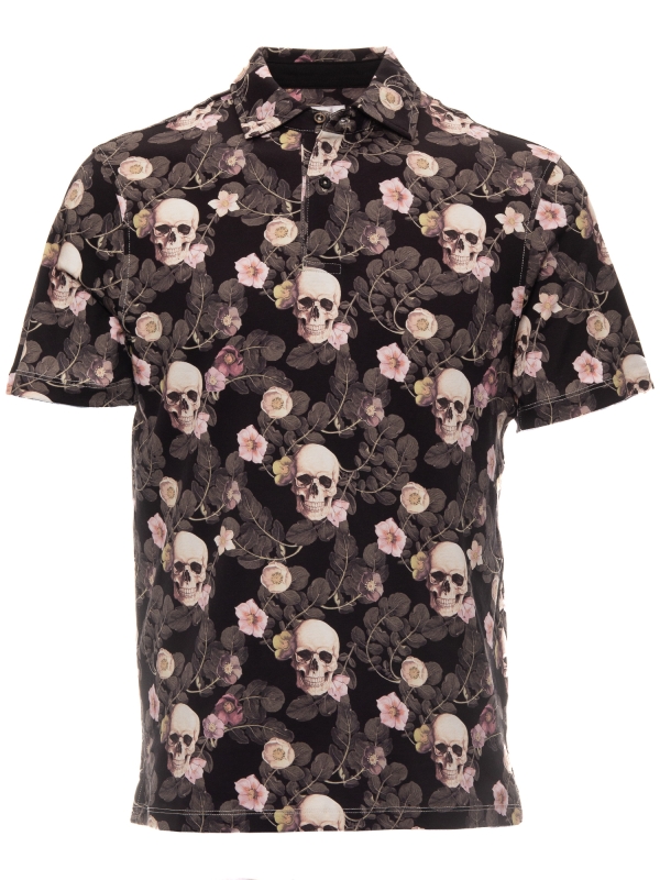 With its bold vanities flowers print, this polo features vibrant skulls and soft florals on a deep black backdrop. Made from mercerized cotton jersey, it offers a smooth, comfortable fit. The cotton piqué collar adds refinement, while the regular fit and two-button placket complete the look. A striking fusion of edgy style and classic craftsmanship.