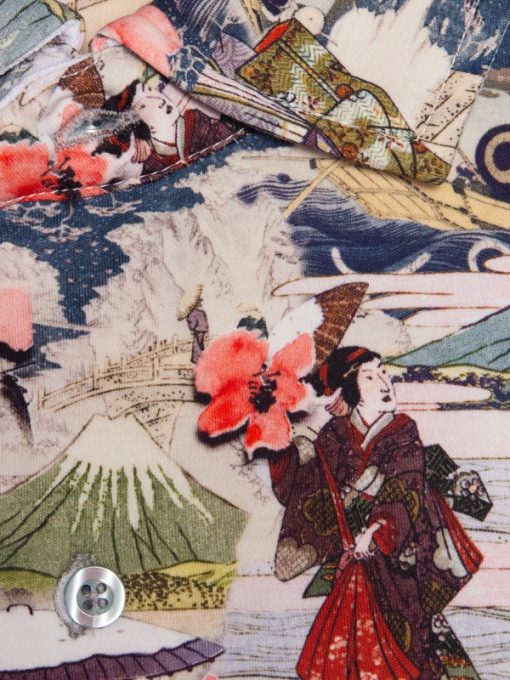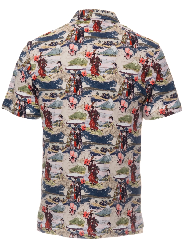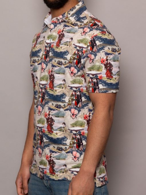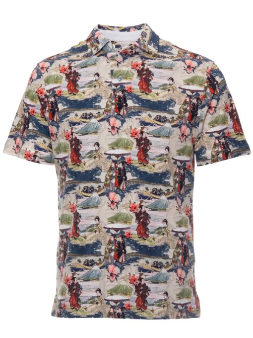 Transport yourself to serenity with this vintage Japanese print polo, featuring soft tones that evoke peaceful landscapes. Crafted from mercerized cotton jersey, it offers a smooth, luxurious feel. The cotton piqué collar adds structure, while the regular fit ensures a refined yet relaxed look. Finished with a two-button placket, it’s a perfect blend of elegance and artistry. A timeless piece for those who appreciate subtle sophistication.