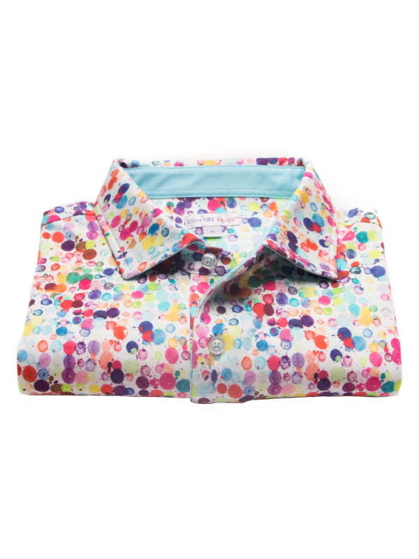 Want to bright up your wardrobe for the summer? Choose this fitted polo shirt with watercolor print! Its short sleeves and its composition in mercerized cotton jersey will make you feel comfortable right away. The summer colors will be perfect to cheer up any outfit, while the piqué cotton collar and two-button placket will bring the touch of elegance that you love so much.