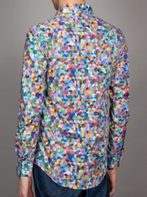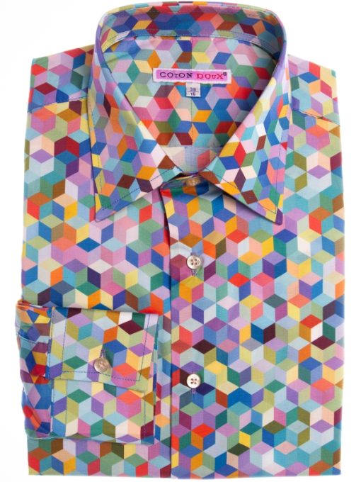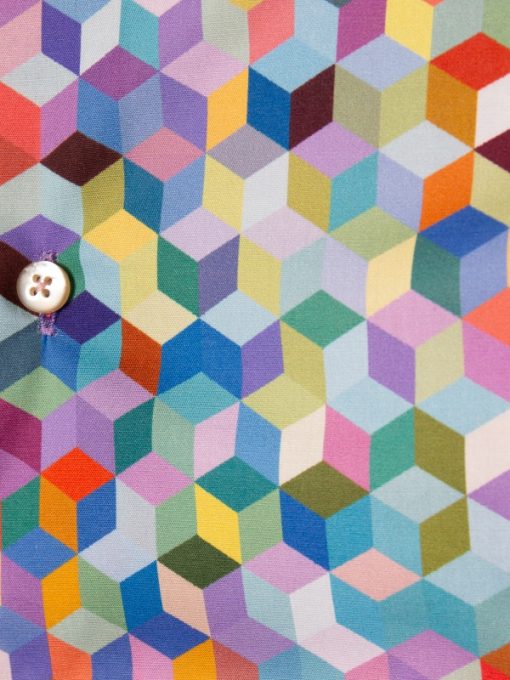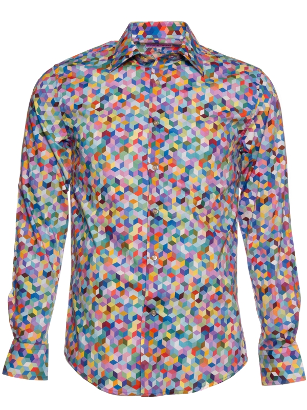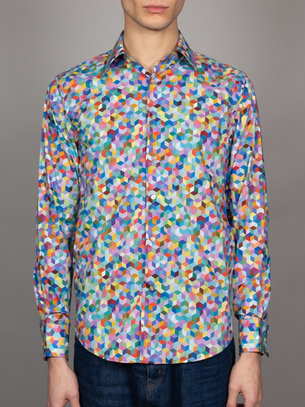 This shirt brings a vibrant energy to life with its striking 3D cube print in a dazzling mix of colors. The geometric pattern pops with depth and movement, creating a visually dynamic effect that draws the eye. The Milanese collar and single cuffs add a refined touch, while the regular fit ensures comfort and ease.