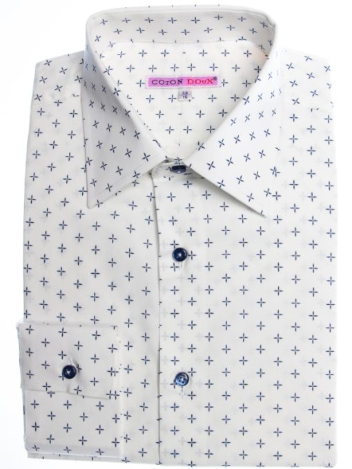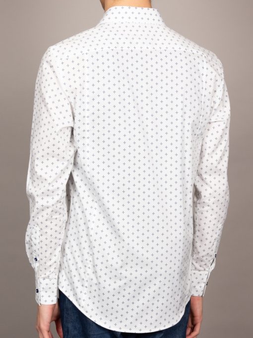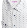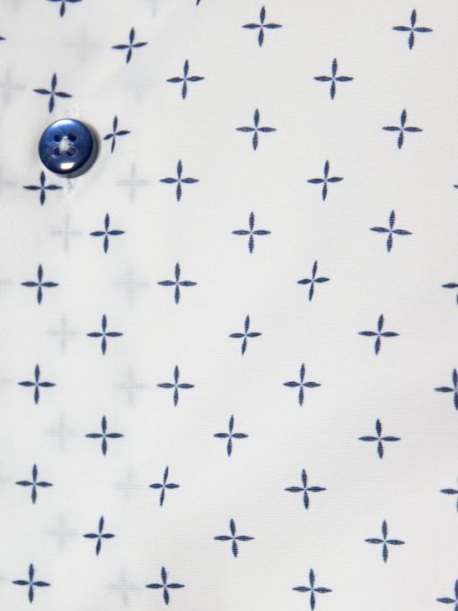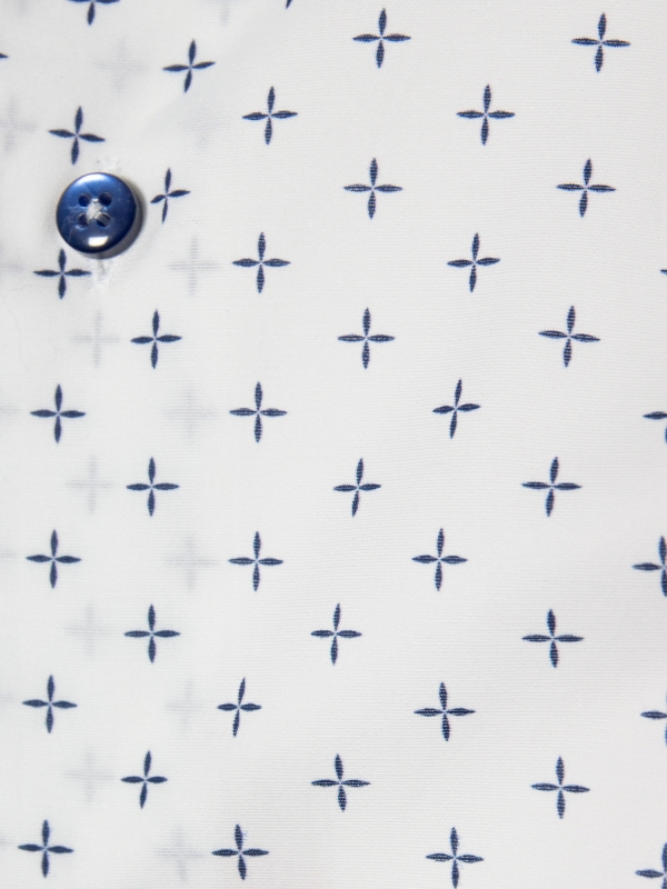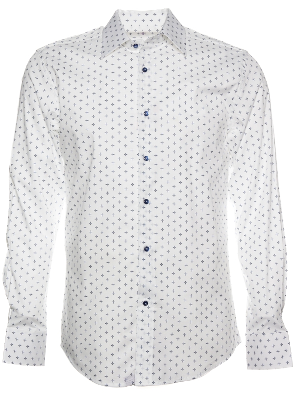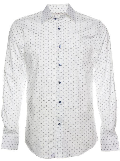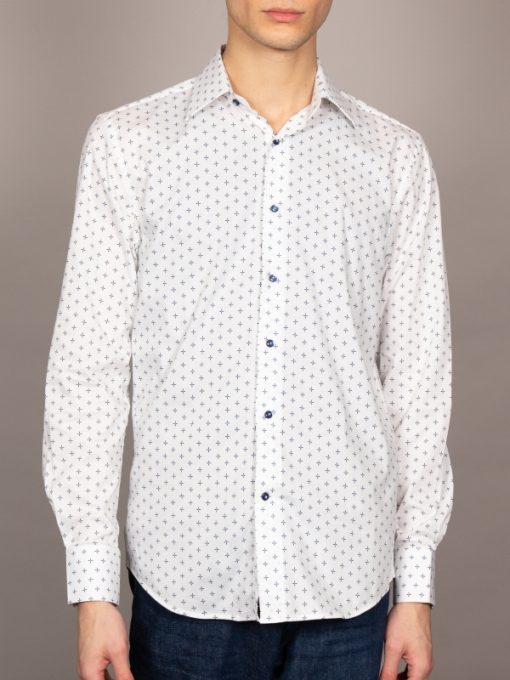 With its clean white canvas and striking blue cross print, this shirt balances simplicity and boldness in perfect harmony. The Milanese collar and single cuffs lend a refined edge, while the regular fit offers a relaxed yet tailored silhouette. A pattern that commands attention without overwhelming, it’s a piece that speaks of quiet confidence and modern style.
