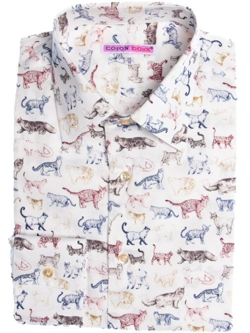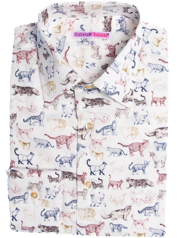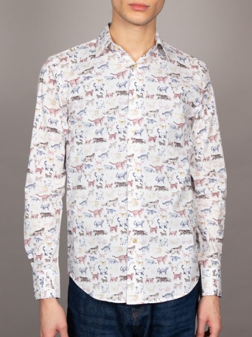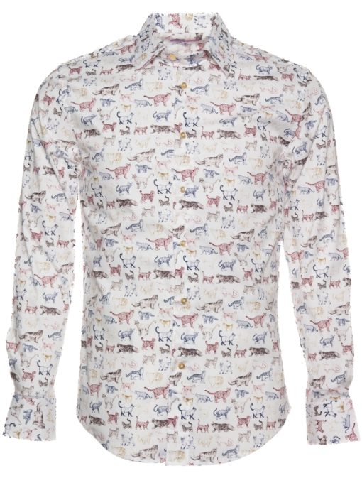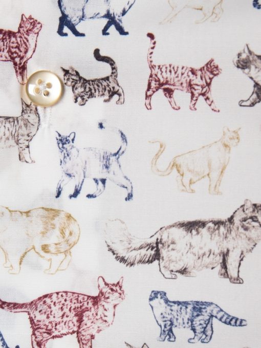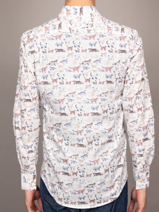 Let your style pounce with this lively cat print shirt, where a chorus of colorful felines prance across the fabric in joyous abandon. Crafted with a Milanese collar, single cuffs, and a regular fit, it marries playful charm with understated elegance. The striking print adds a bold dimension, making this shirt both a statement and a masterpiece. Perfect for those with an eye for the quirky yet refined.