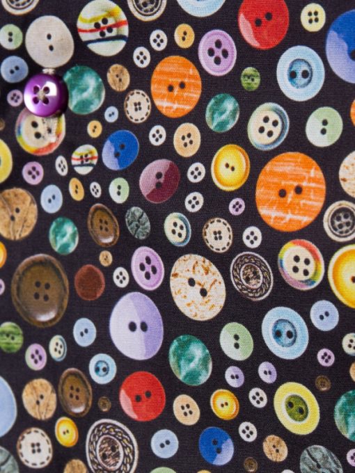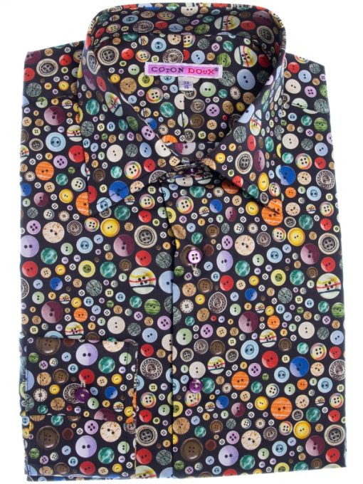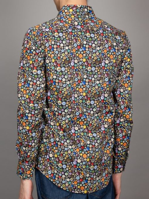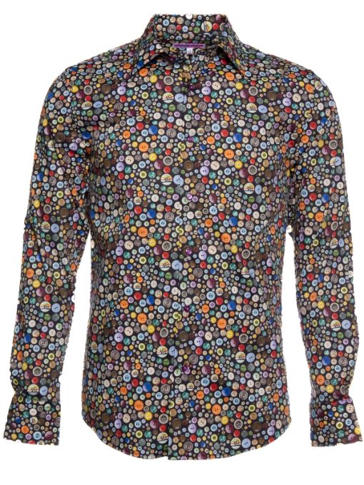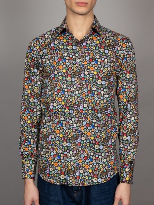 Against a bold black backdrop, this shirt bursts with color through its multicolored button print, adding an unexpected twist to classic style. The Milanese collar and single cuffs bring an element of sharpness, while the regular fit ensures effortless comfort. A fusion of playful expression and refined structure, it pairs seamlessly with leather bootsfor a look that’s both daring and distinguished,