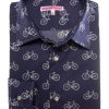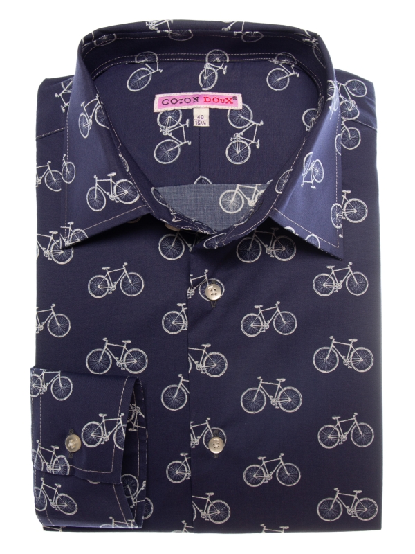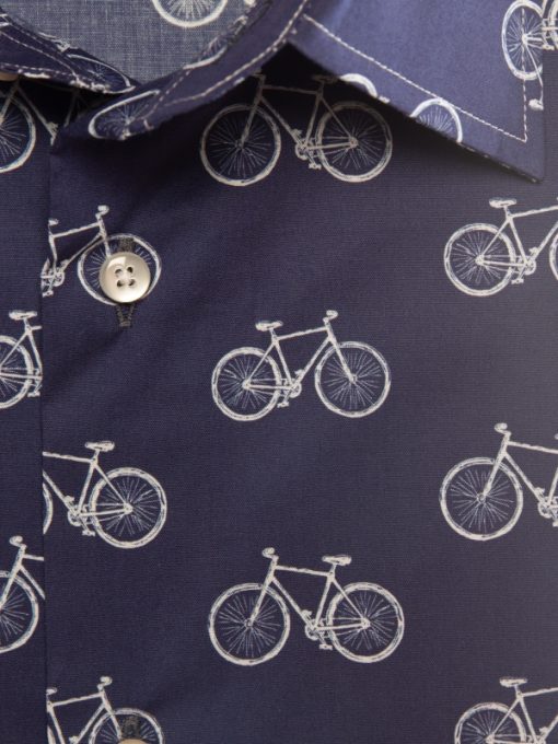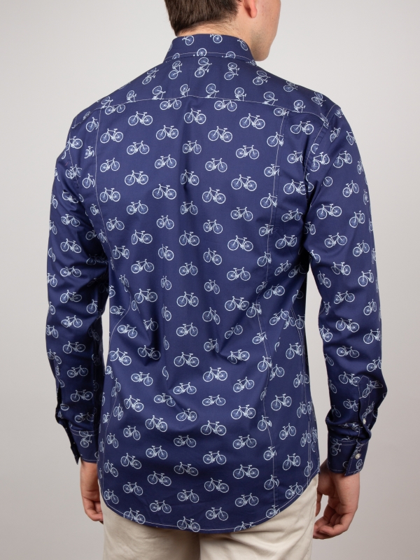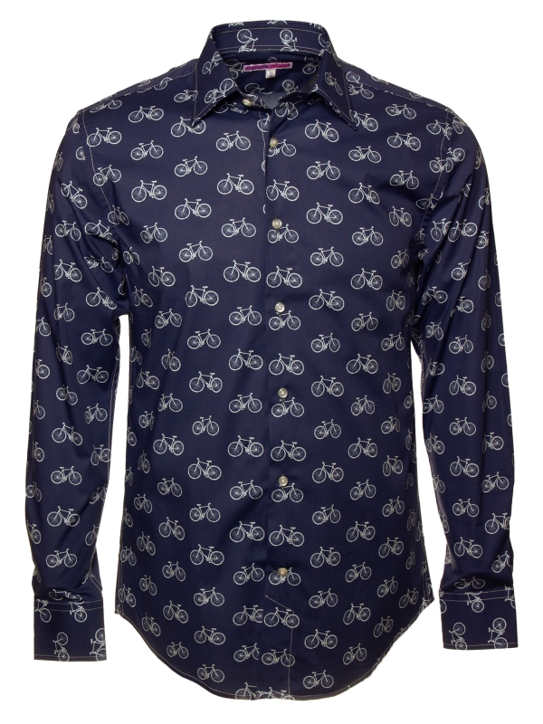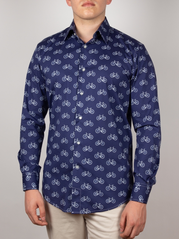 This bicycle-print shirt strikes a perfect balance between casual ease and refined sophistication. Its regular fit gently shapes the silhouette, complemented by a Milanese collar and minimalist cuffs that add an elegant touch. The finely detailed bicycle motif offers a fresh, original take on a classic theme. Ideal for cycling lovers or anyone who values unique, thoughtful design.