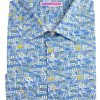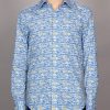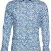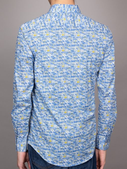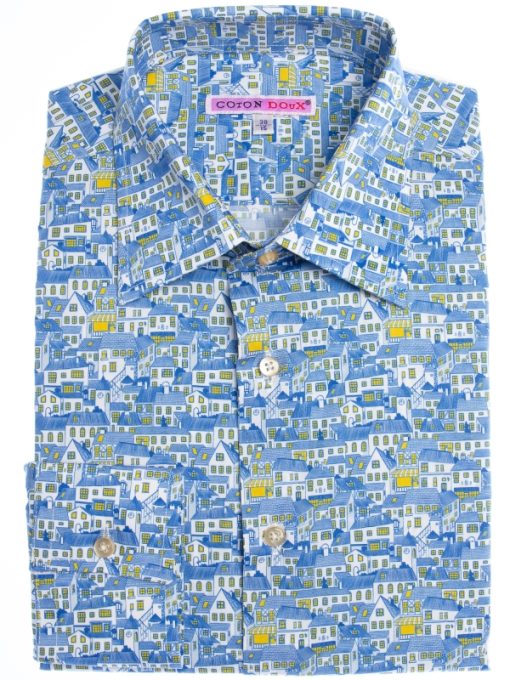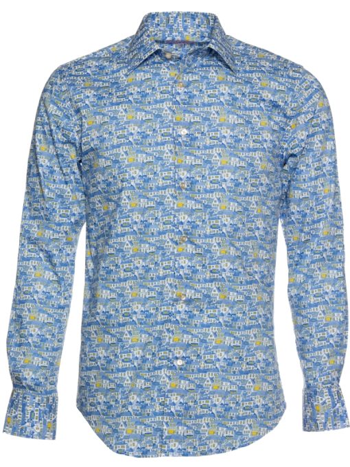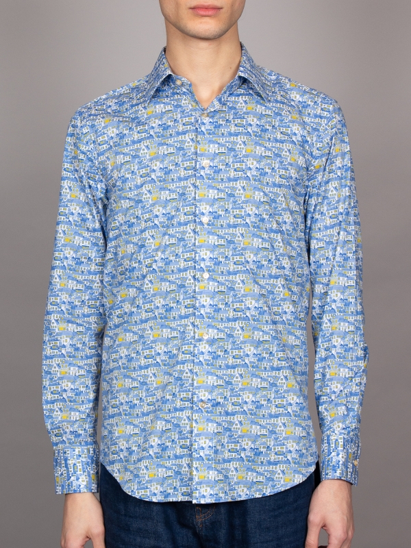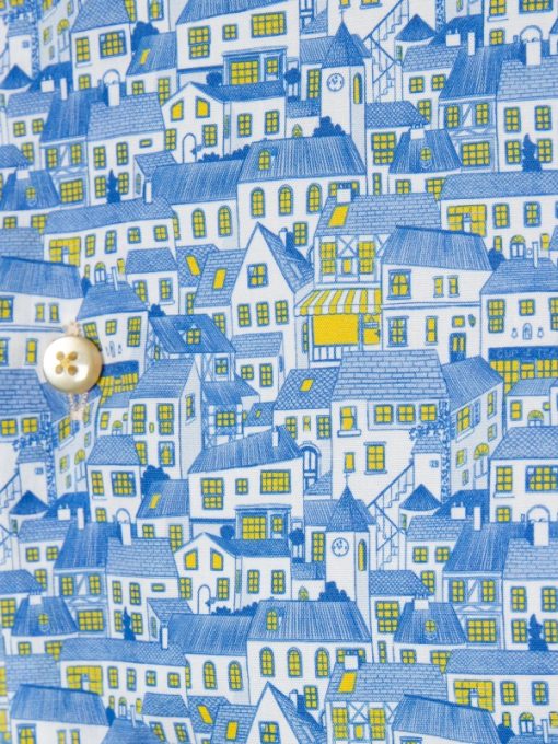 Step into a charming evening scene with this shirt, featuring a captivating house print on a white background. The blue houses, illuminated by warm yellow lights from the windows and street lamps, evoke the cozy ambiance of a neighborhood at dusk. With its Milanese collar, single cuffs, and regular fit, this shirt combines artful design with clean tailoring. Pair it with beige chinos for a look that’s both inviting and distinctive.