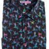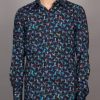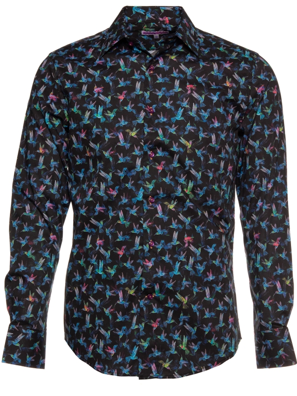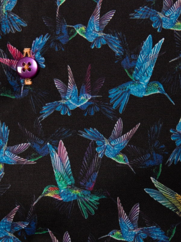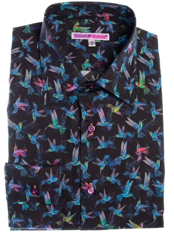 Soar into style with this shirt, featuring a striking hummingbird print in vibrant blue against a deep black background. The delicate hummingbirds, frozen in mid-flight, bring a sense of elegance and energy to the design, evoking a feeling of grace and movement. The Milanese collar and single cuffs add a refined touch, while the regular fit ensures comfort.