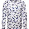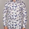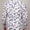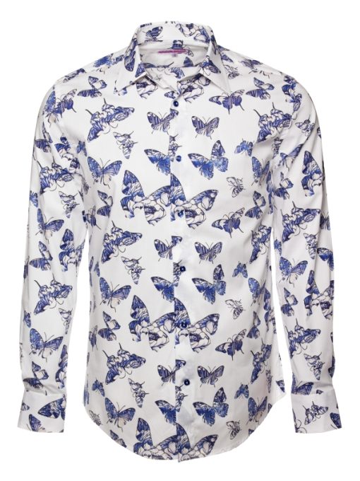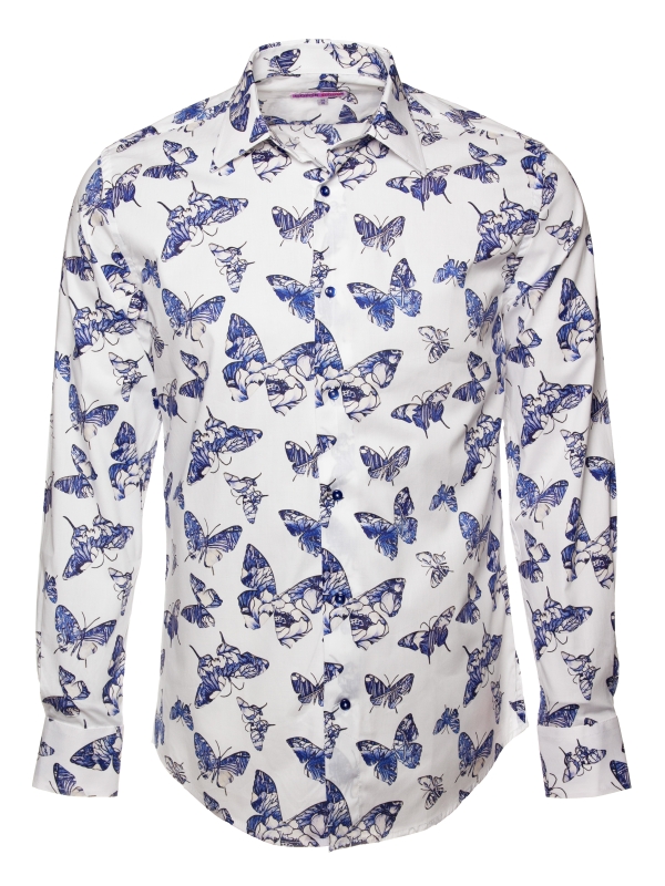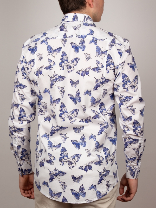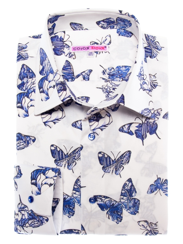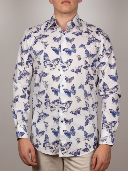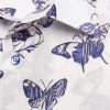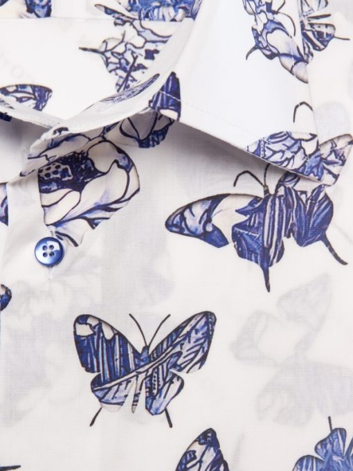 Infuse your wardrobe with poetry through this indigo butterfly-print shirt. Crafted in a regular cut that gently shapes the silhouette, it features a Milanese collar and minimalist cuffs for an understated elegance. The blue-toned butterflies, delicately scattered across the fabric, appear to flutter gracefully, creating a subtle dance between whimsy and refinement. An ideal piece for those who seek to showcase their individuality while embracing a timeless, polished style.