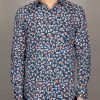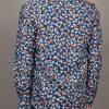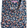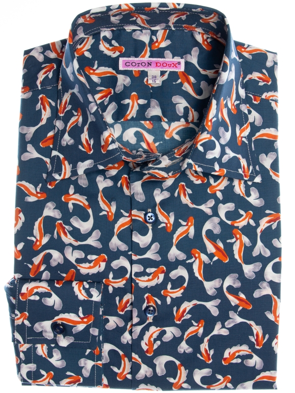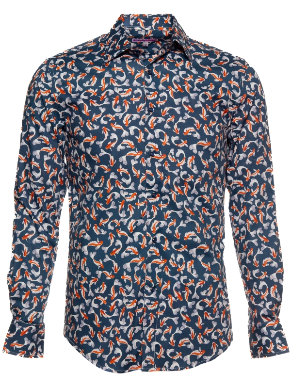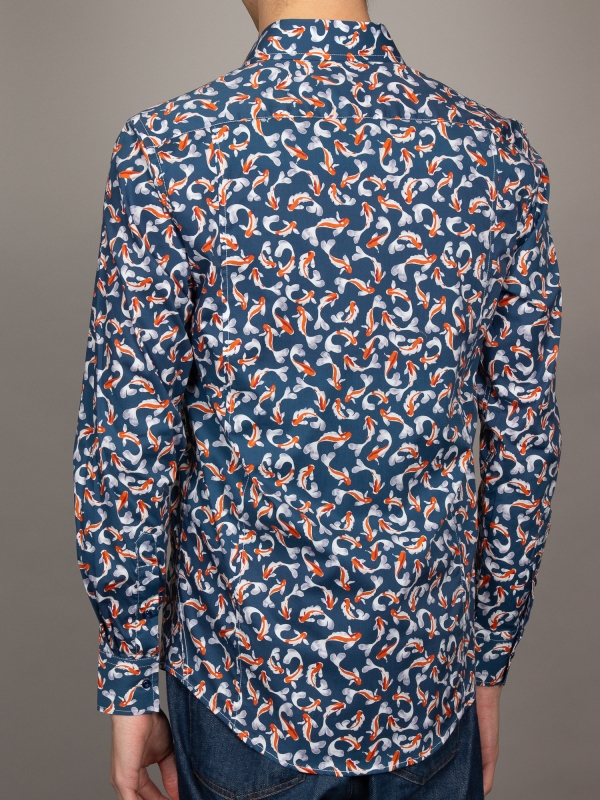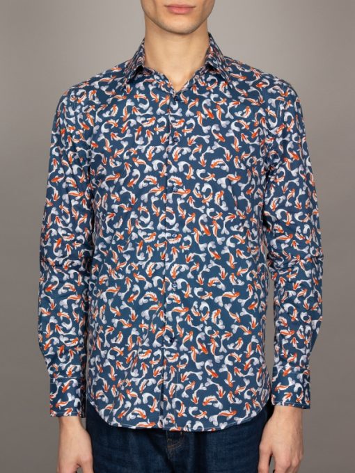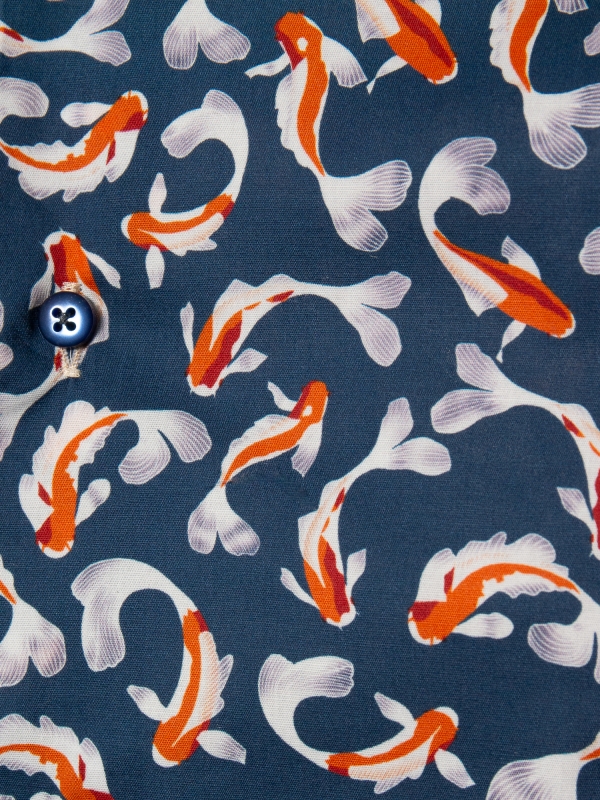 Like a vivid brushstroke on a dark canvas, koi fish in orange and white swim gracefully across the navy backdrop of this shirt. The Milanese collar and single cuffs bring a touch of sharp refinement, while the regular fit offers effortless comfort. A harmonious blend of bold design and timeless style, it pairs perfectly with chinos or jeans for a look that’s as striking as it is serene.