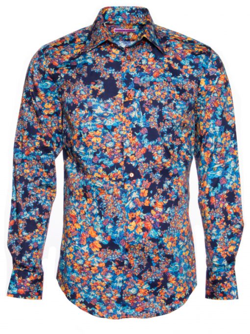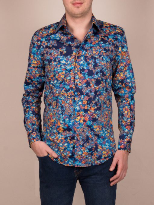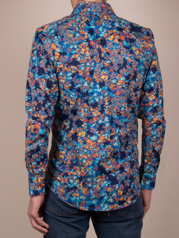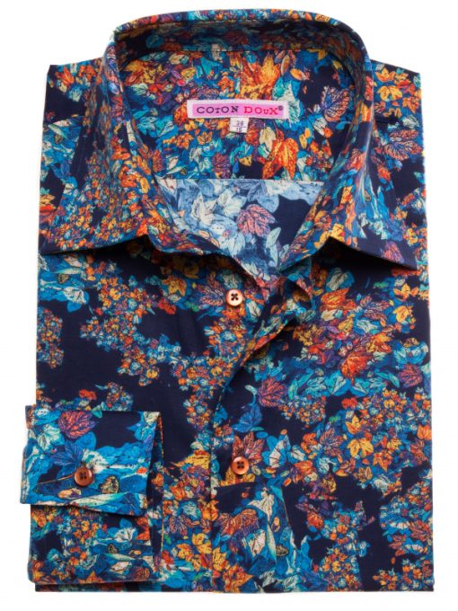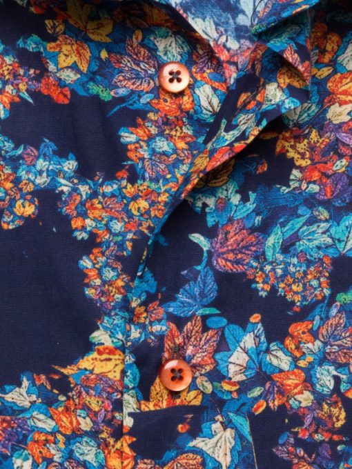 The leaf pattern on this regular-fitted shirt, adorned with a Milanese collar and single-button cuffs, offers a palette of warm colors which compliment the contrasting dark background. Some selvage denim jeans will pair perfectly with the homely feel of this shirt.