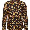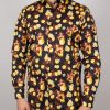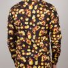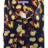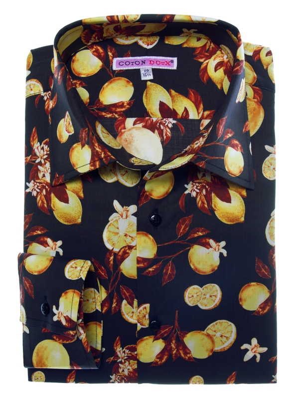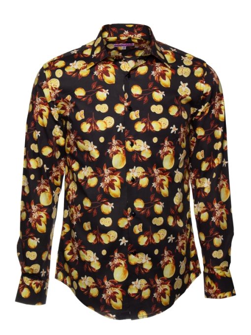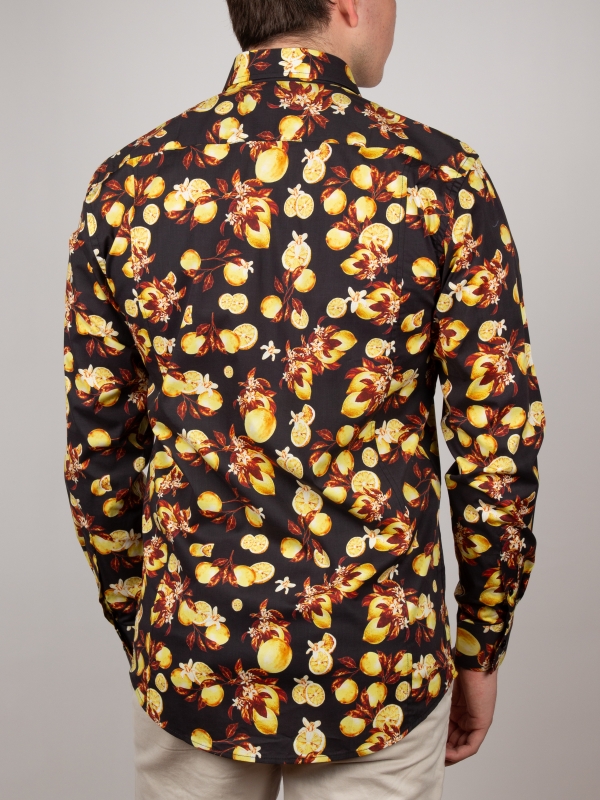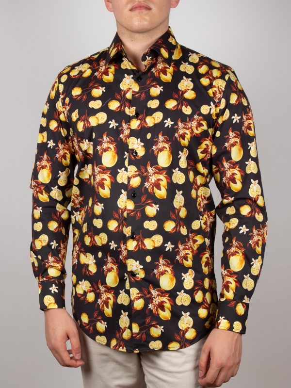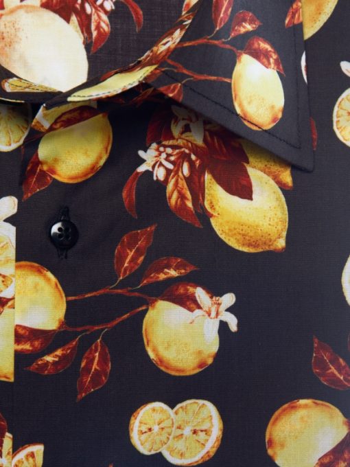 Add a vibrant splash to your wardrobe with this shirt featuring bright yellow lemons on a sleek black backdrop. The regular cut, paired with a structured Milanese collar and minimalist cuffs, ensures a sharp silhouette. The striking contrast between the dark base and lively pattern delivers a bold, graphic statement. Perfect for those who enjoy mixing freshness with sophistication and a touch of playfulness.