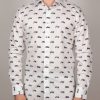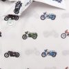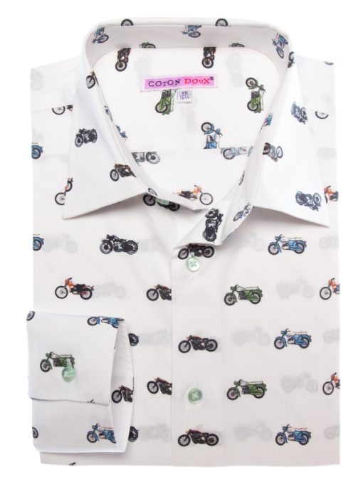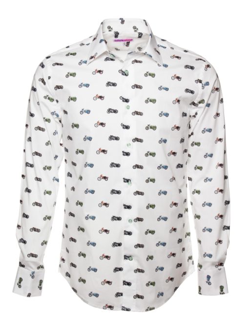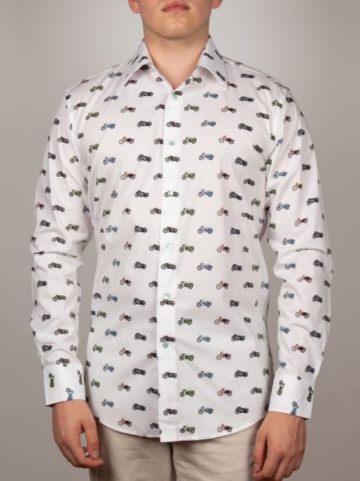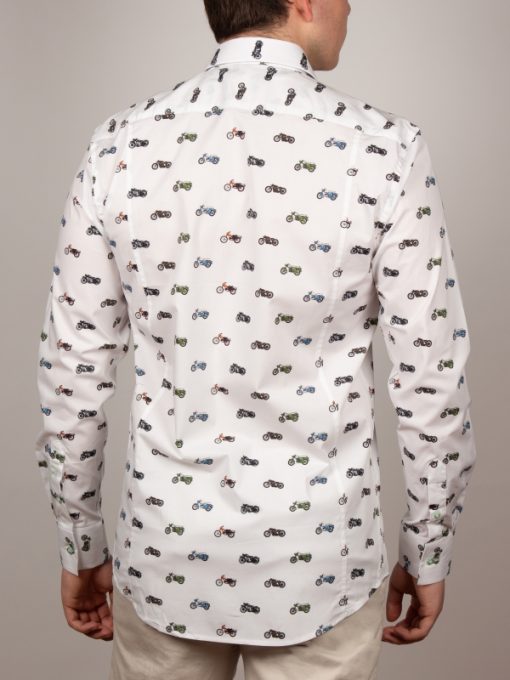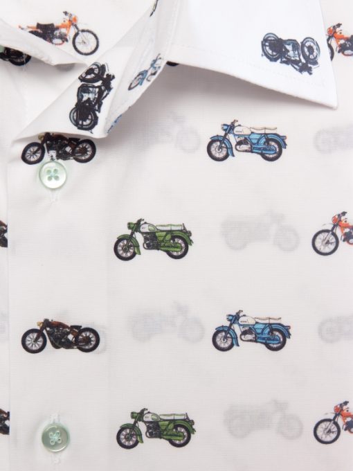 This motorbike-print shirt captures a rebellious spirit with a polished, contemporary twist. Its regular cut shapes a clean, modern silhouette, framed by a sleek Milanese collar and subtle cuffs. Detailed motorbike motifs bring dynamic energy and graphic impact, balancing bold attitude with refined sophistication. Perfect for those who want to stand out while keeping an effortless, elegant look.