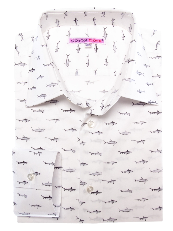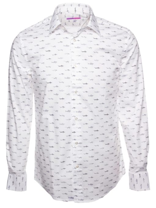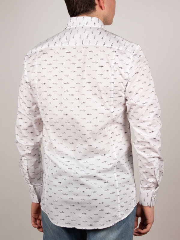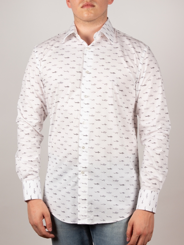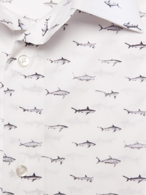 This shark-print shirt strikes the perfect balance between classic sophistication and daring flair. Featuring a regular cut that shapes a clean, structured silhouette, it’s detailed with a crisp Milanese collar and simple single cuffs. The finely rendered sharks glide subtly across the fabric, injecting a playful confidence that stays tasteful and refined. A standout piece that seamlessly moves from professional settings to evening outings