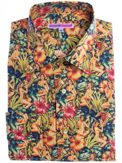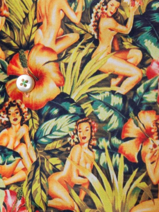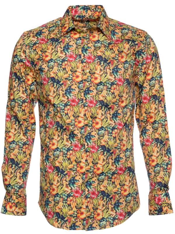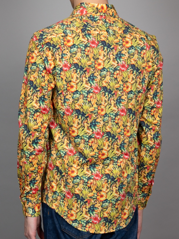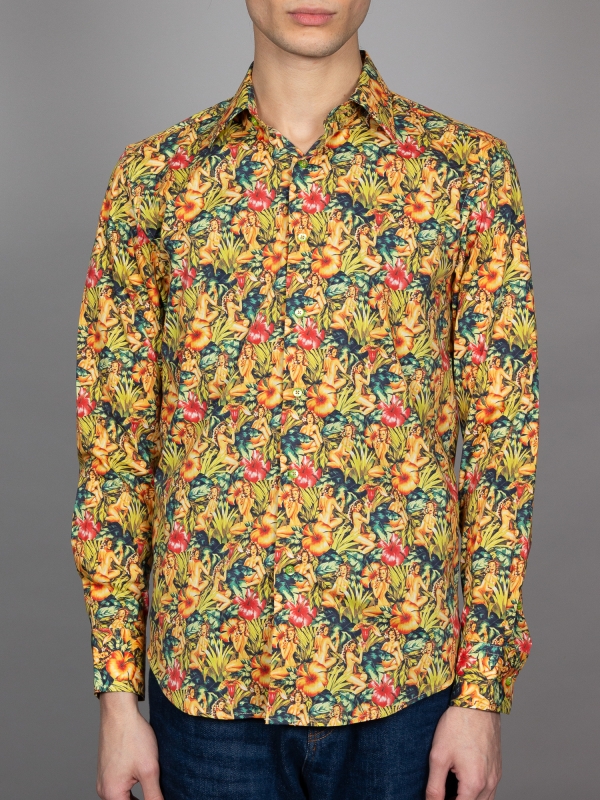 Step back into the sun-drenched days of the fifties with this shirt, featuring a vibrant pin-up tropical print in shades of yellow and green. Silhouettes of retro-inspired women blend seamlessly with lush foliage, evoking the bold, carefree spirit of the era. The Milanese collar and single cuffs add a refined touch, while the regular fit ensures ease and comfort. Pair it with crisp white shorts for a look that’s both vintage and effortlessly chic.