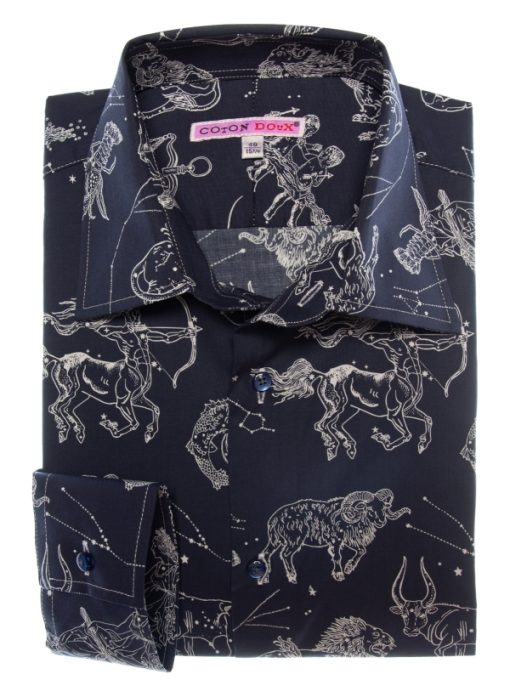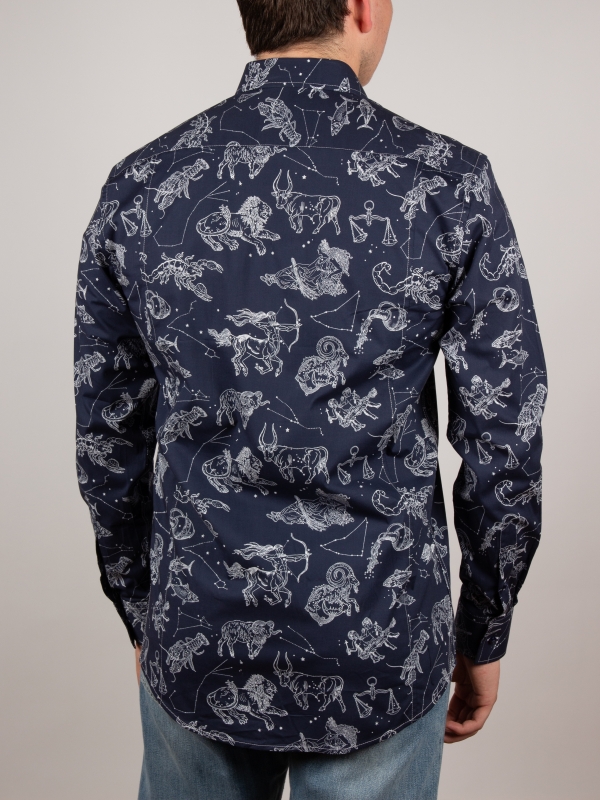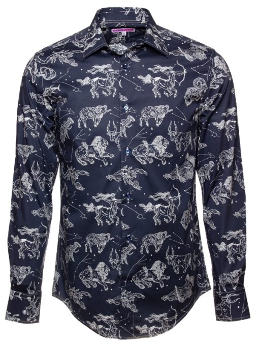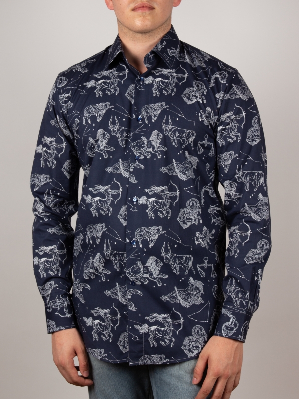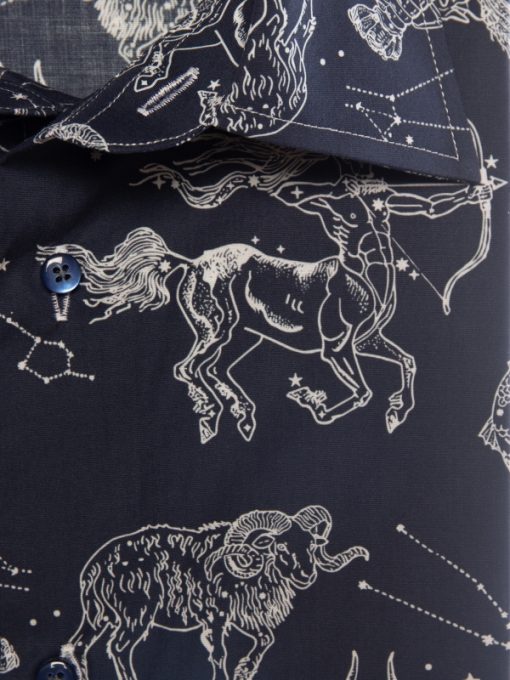 Add a celestial spark to your wardrobe with this star sign print shirt. Featuring a regular fit that shapes a sleek, modern silhouette, it’s detailed with a polished Milanese collar and minimalist cuffs. Delicately rendered constellations and celestial symbols create a mysterious and captivating pattern that enchants at every glance. Ideal for those who want to showcase their style with personality and a subtle cosmic touch.