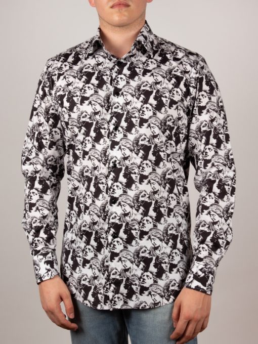 Drawing inspiration from neo-classical charm, this statue-print shirt embodies artistic elegance. The regular fit shapes the silhouette with subtle precision, complemented by a sleek Milanese collar and minimalist cuffs that add modern sophistication. Marble faces and sculpted figures adorn the fabric like a living gallery, seamlessly merging timeless antiquity with contemporary design. A standout piece for those who cherish the harmonious blend of art and fashion.