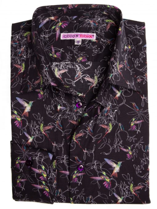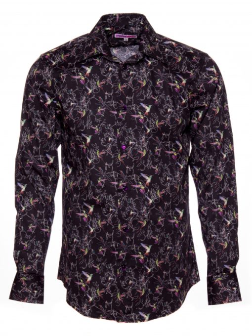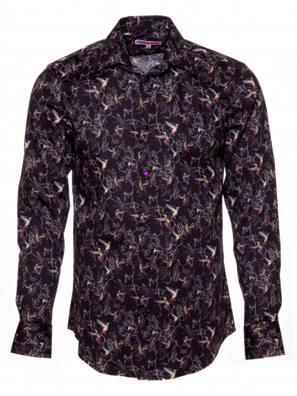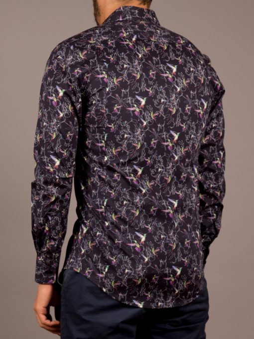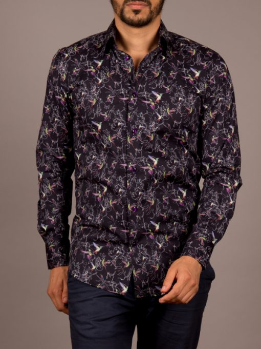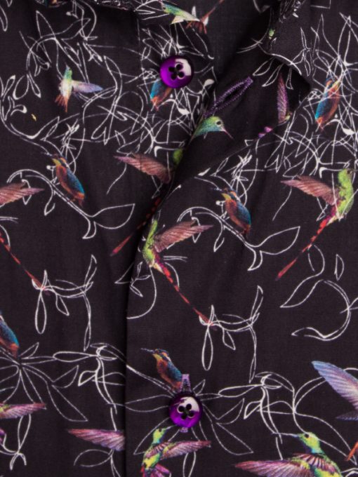 Add a touch of exoticism to your wardrobe with this regular fit shirt with hummingbird print. The black background, decorated with these small colorful birds and finely drawn leaves, brings delicacy and modernity to the model. Moreover, single-button cuffs and Milanese collar will ensure a chic look while remaining original!