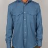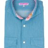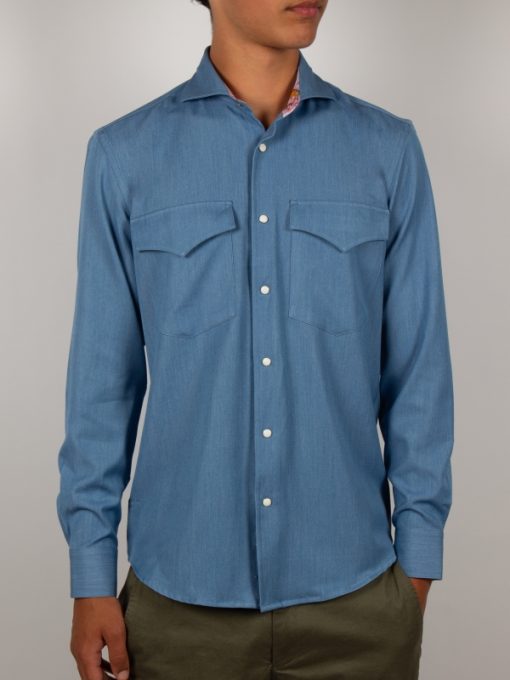 This light blue denim western shirt reinterprets casual elegance with its regular, tailored fit, bold cutaway collar, and practical snap buttons. In contrast, the cherry blossom print on the inner lining adds a delicate, floral touch a poetic nod to spring. An unexpected detail that enhances the piece with subtlety and originality.