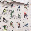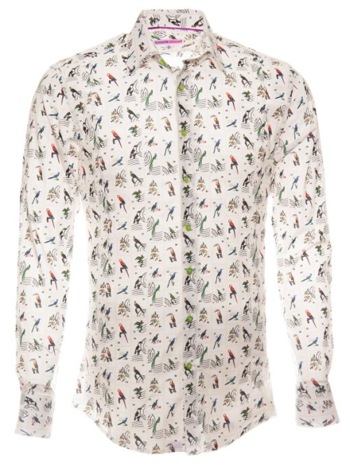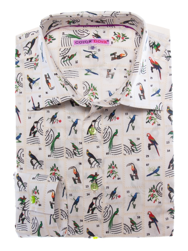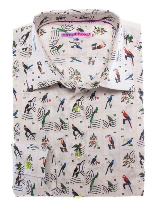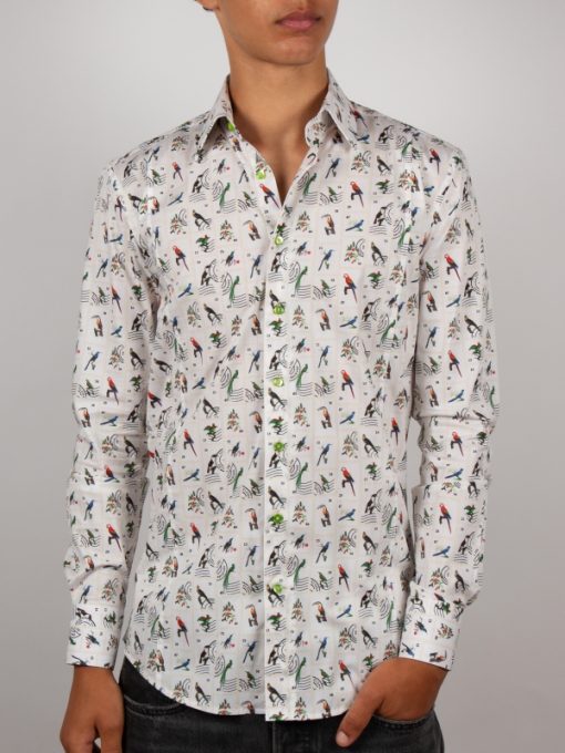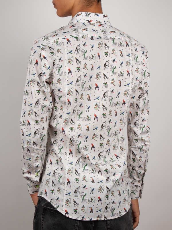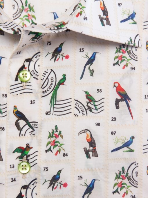 Travel through time and nature with this slim fitted shirt showcasing a bird stamp print. Each motif recalls a vintage collection, set against an elegant backdrop with nostalgic accents. The Milanese collar and simple cuffs add a touch of distinction, perfect for a style that’s both curious and refined. Pair it with linen trousers or raw denim for a subtly original look.