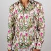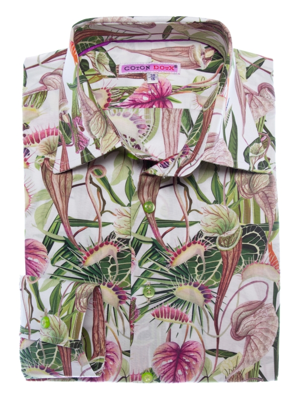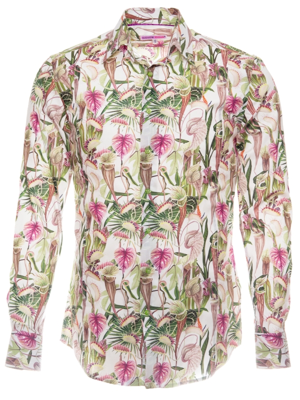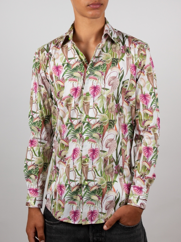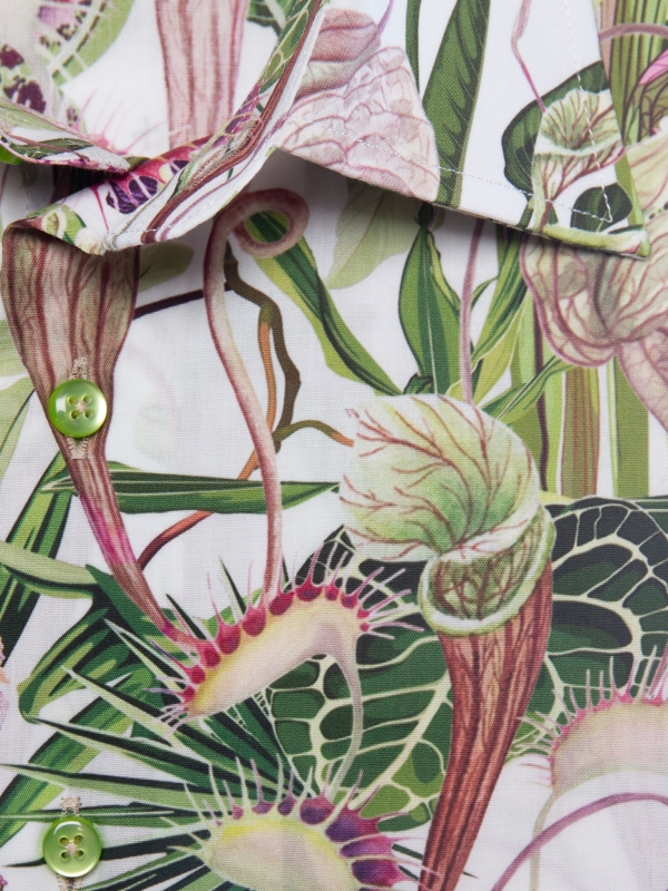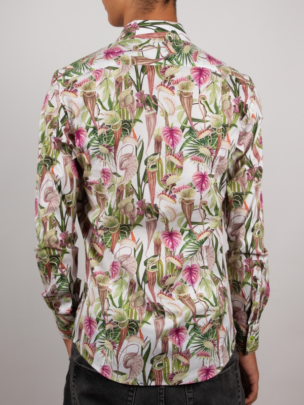 Immerse yourself in a captivating botanical world with this slim fitted shirt featuring a carnivorous plant print. Set against a subtle background, the motifs reveal a wild yet refined nature that intrigues at every glance. The Milanese collar and simple cuffs add an elegant touch to this boldly styled piece. Pair it with simple trousers for a look that’s original and full of character.
