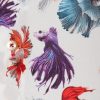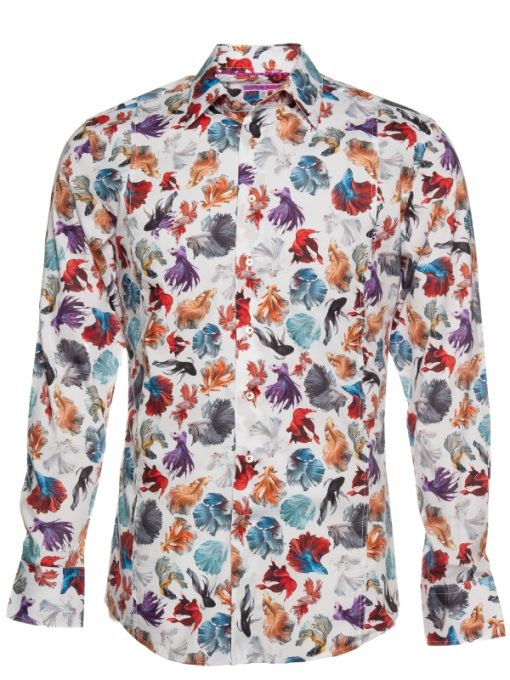 This shirt features a dynamic print of fighting fish, swimming in various shades against a clean white background. The contrast between vibrant colors and the simplicity of the white canvas creates a striking effect. With a Milanese collar and single cuffs, it maintains a refined yet playful aesthetic. The slim fit adds a modern edge, ensuring a sharp and polished look.