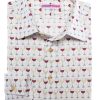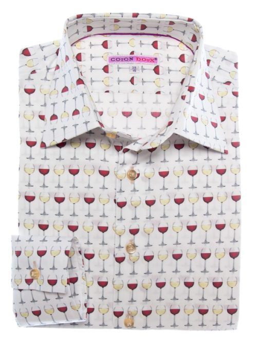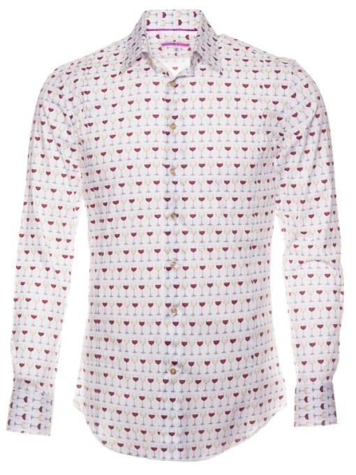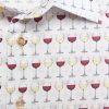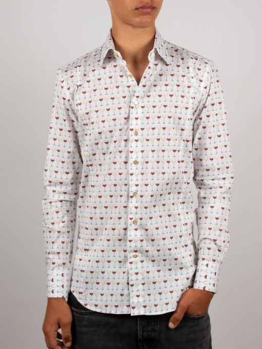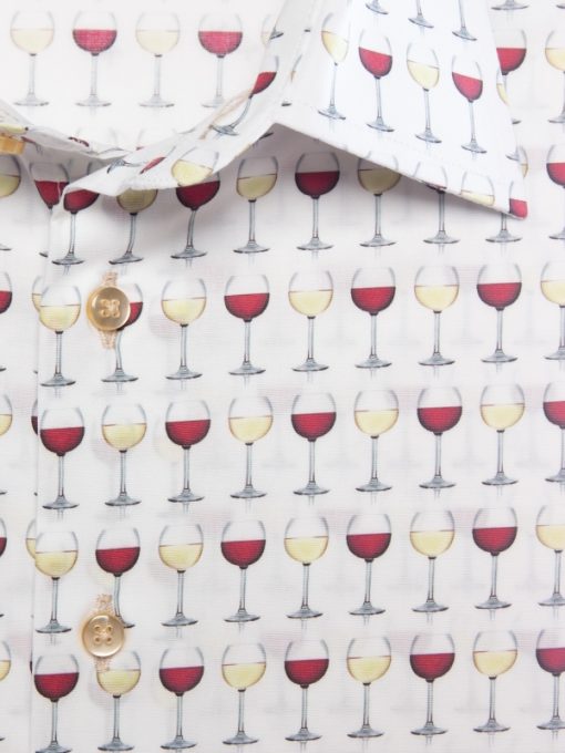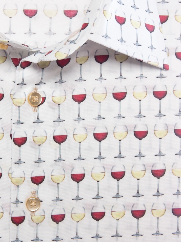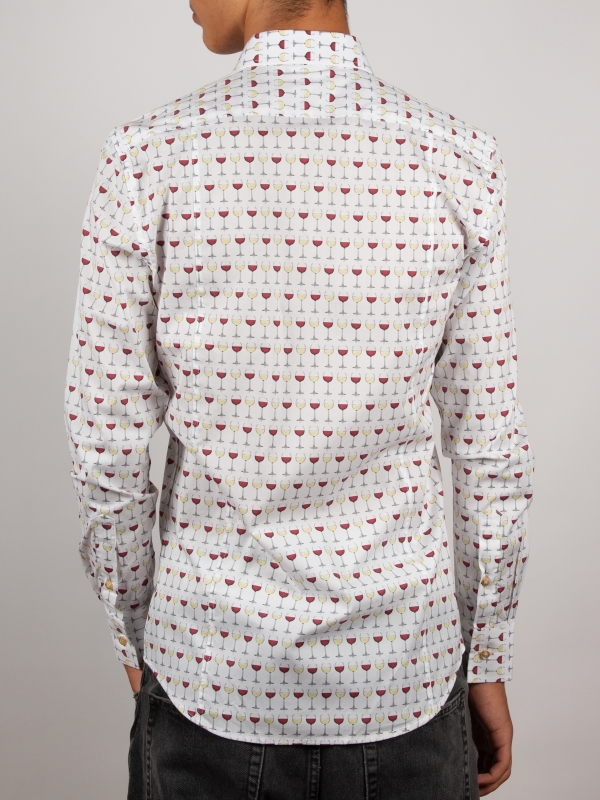 Elegance and conviviality blend seamlessly in this slim fitted shirt featuring a wine glass print. Set against a crisp white background, the delicate motifs evoke joyful moments with style and ease. The Milanese collar and simple cuffs add a polished touch to this piece, ideal for a chic yet casual look. Pair it with light-colored pants or jeans for a refined, modern outfit.