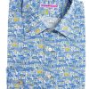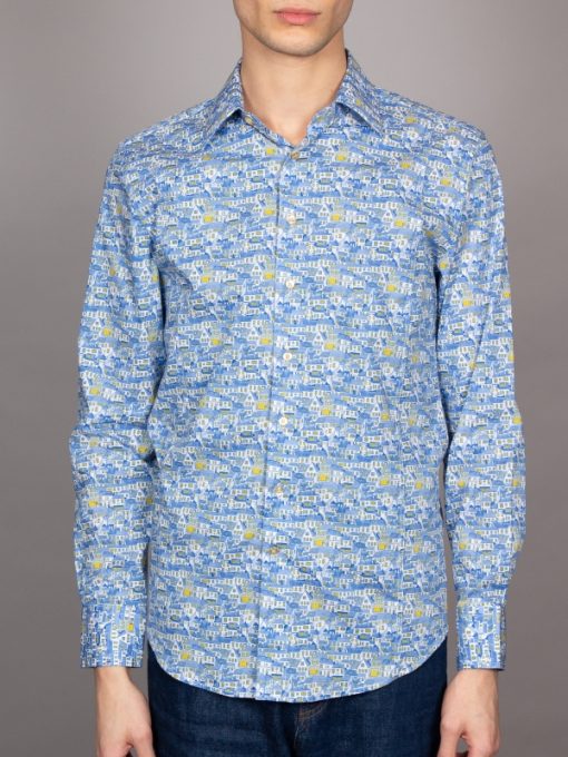A serene nightscape comes to life on this white shirt, where charming blue houses stand as if bathed in soft moonlight. The warm yellow lights glow gently from within, capturing the quiet allure of a peaceful evening. The Milanese collar adds sophistication, while the slim fit brings modern refinement to this tranquil print. With single cuffs to complete the look, this shirt is ideal for anyone seeking a subtle yet captivating design.