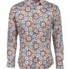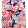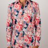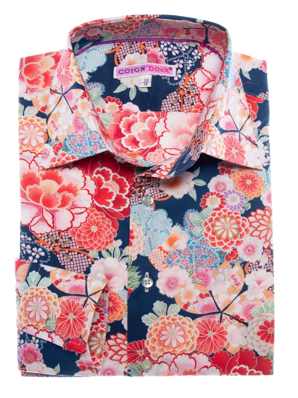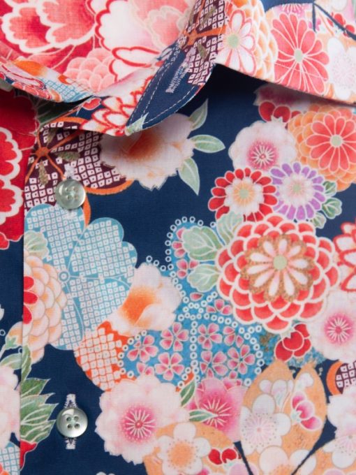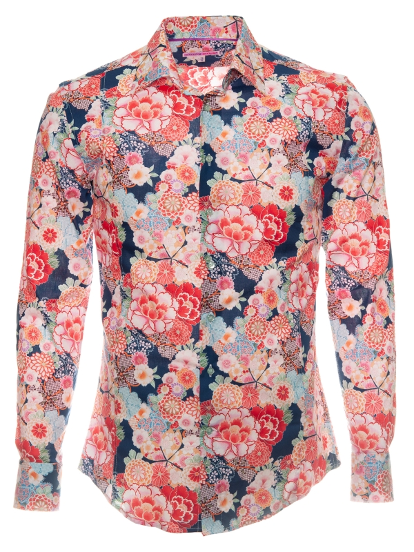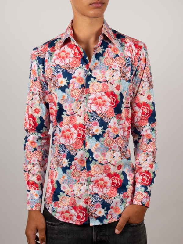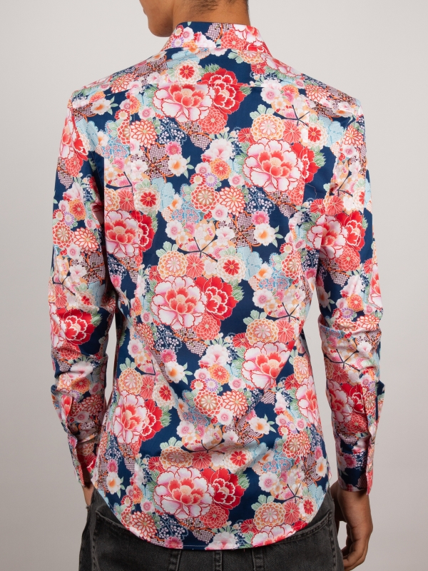 Evoking the delicacy and richness of Japanese art, this slim fitted shirt features a floral print blending shades of red, pink, and blue with harmony. The vibrant patterns are gracefully spread across the fabric, creating a look that is both refined and lively. The Milanese collar and simple cuffs add a clean finish, perfect for highlighting this colorful piece. Pair it with simple pants for a sophisticated and poetic style.