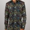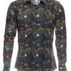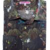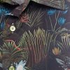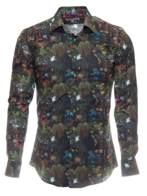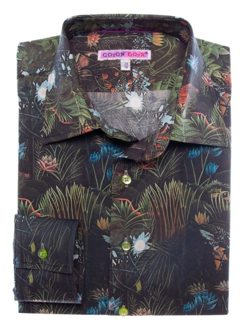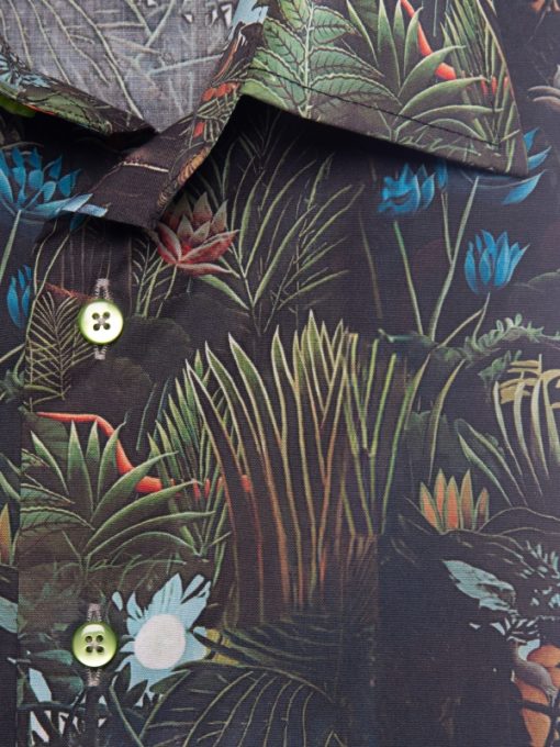 Immerse yourself in lush nature with this slim fitted shirt adorned with a vibrant jungle print. The abundant exotic foliage creates a bold, energetic silhouette. Featuring a Milanese collar and simple cuffs, the shirt blends elegance with a fitted cut that subtly enhances your contours. Perfect for a confidently nature-inspired, chic look.