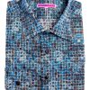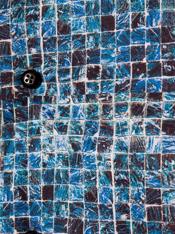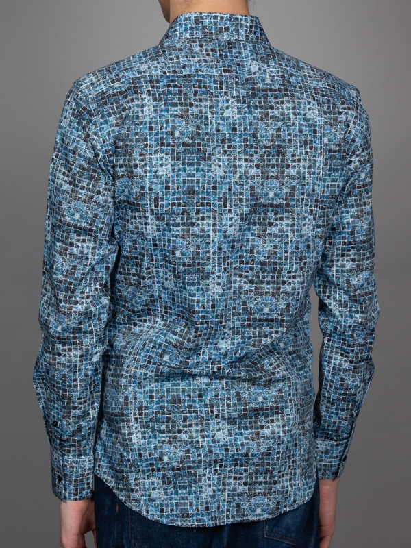 This shirt brings a burst of style with its bold blue and black mosaic print. The soft gradients between the squares give it a subtle yet captivating energy. The tailored cut fits just right, giving you a sleek, flattering silhouette, while the Milanese collar and simple cuffs keep things sharp and polished. Pair it with slim black trousers for a smooth, modern vibe, and finish off with leather boots to give the whole look a fresh, structured edge.