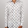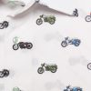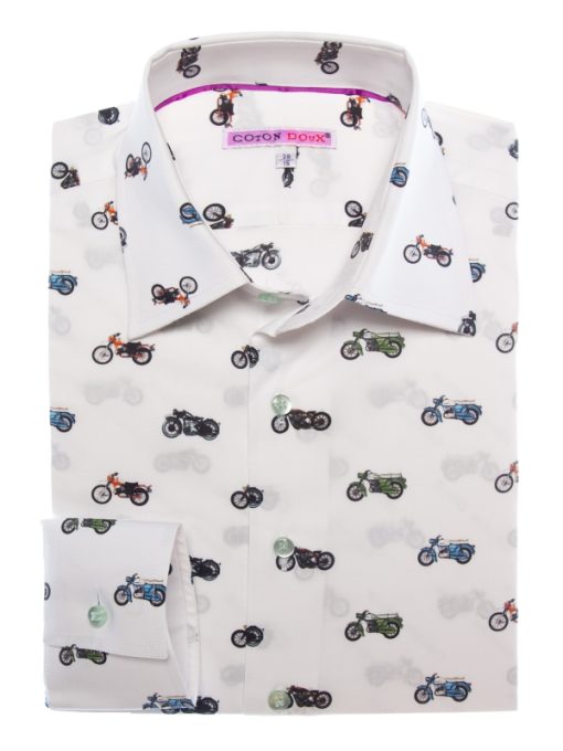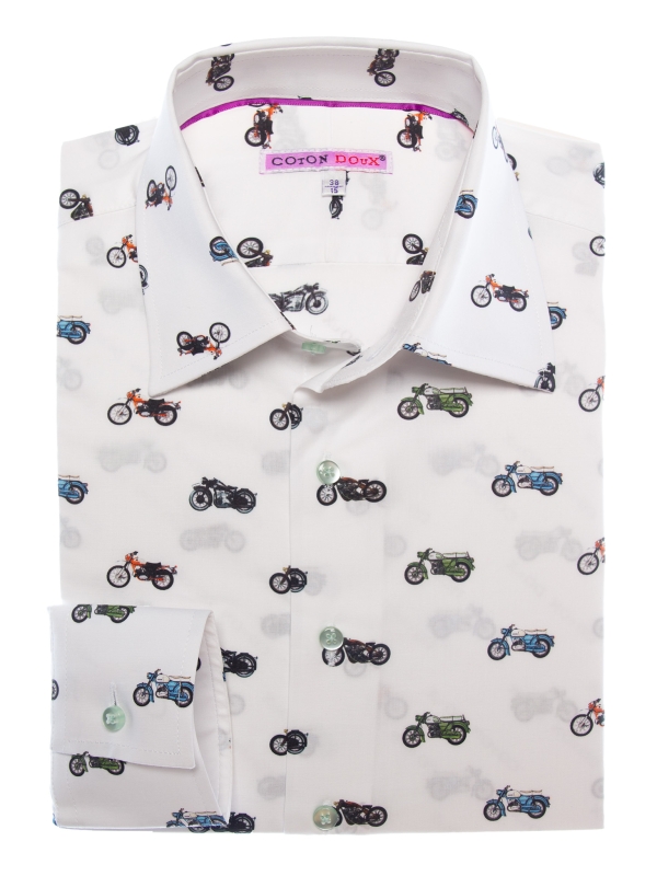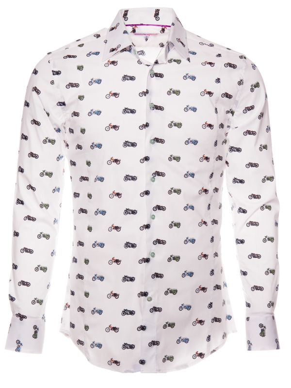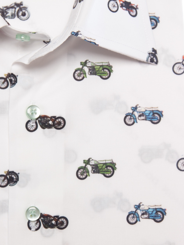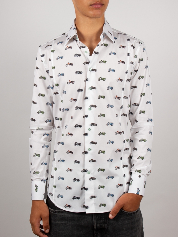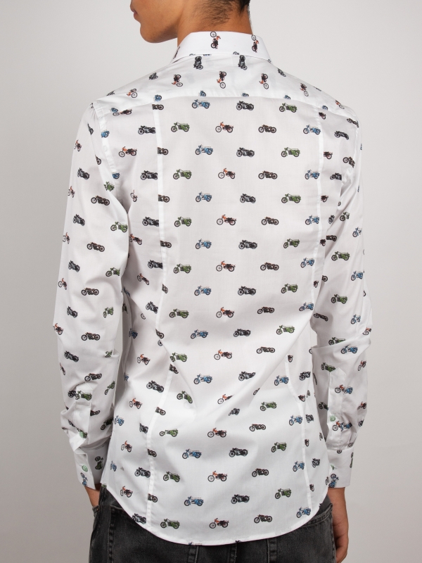 Showcase your passion for bikes with this fitted shirt featuring a motorcycle print. The Milanese collar and simple cuffs complement the slim fit, elegantly enhancing the silhouette. Colorful motorcycles intertwine across the fabric, bringing energy and originality. Perfect for those who blend biker spirit with contemporary sophistication.