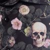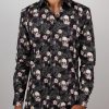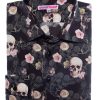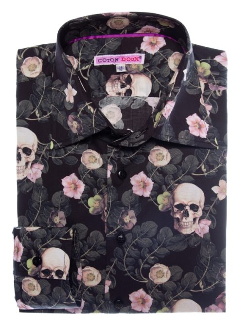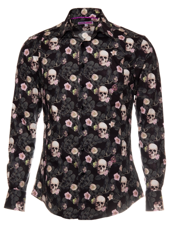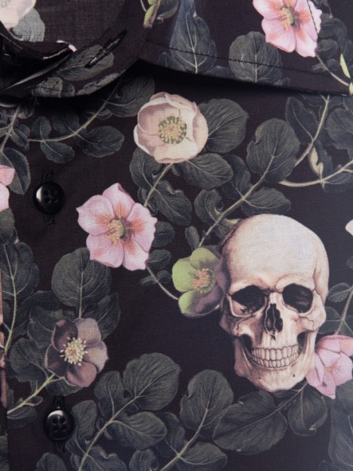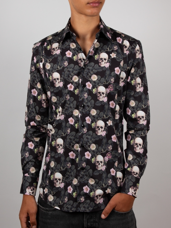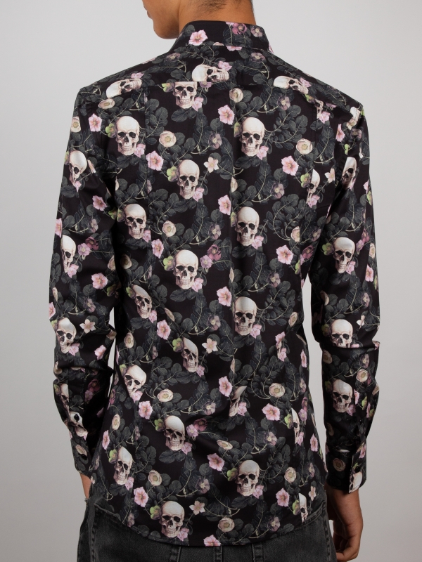 Bold and striking, this slim fitted shirt features a pink skull print that commands attention. Set against a deep black background, delicate floral and skull motifs create a subtle balance between softness and rock spirit. The Milanese collar and simple cuffs add refinement to this uniquely original piece. Pair it with raw denim or black trousers for a bold, contemporary look.