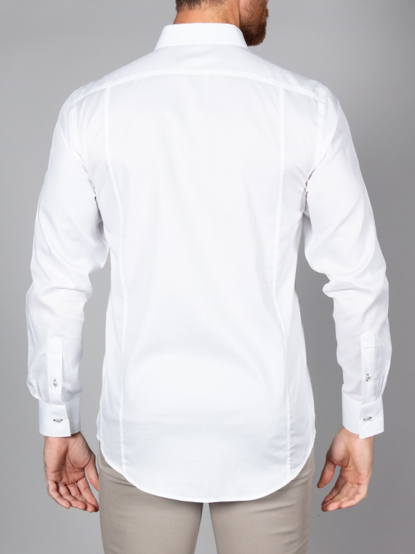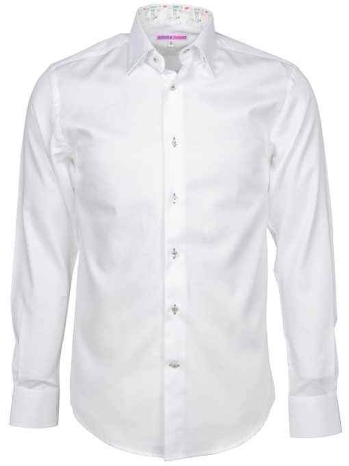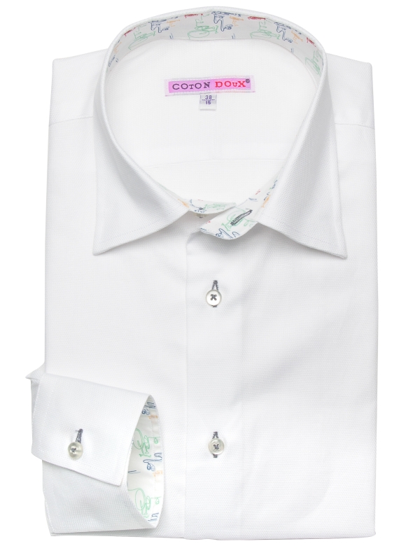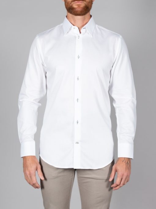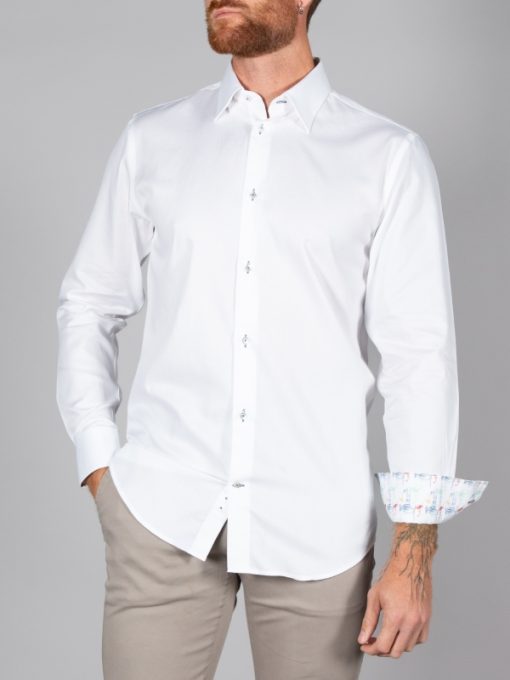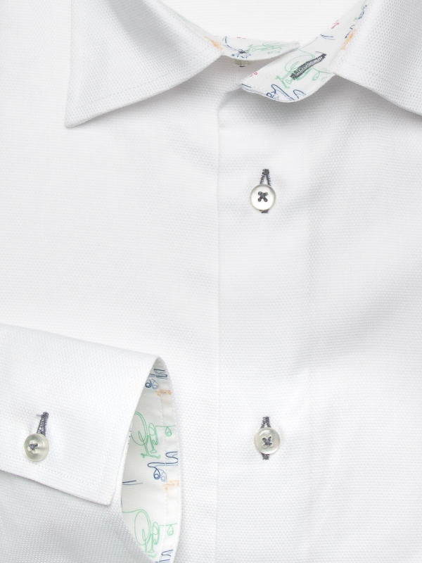 Discover a unique twist on classic style with our men’s white cotton piqué shirt, featuring an eye-catching bike inner lining print. The intricate jacquard texture adds subtle sophistication, while the Milanese collar and simple cuffs contribute a timeless elegance. The regular fit ensures comfort throughout the day. Pair this shirt with grey chinos and loafers for a look that blends refined charm with a hint of playful adventure.